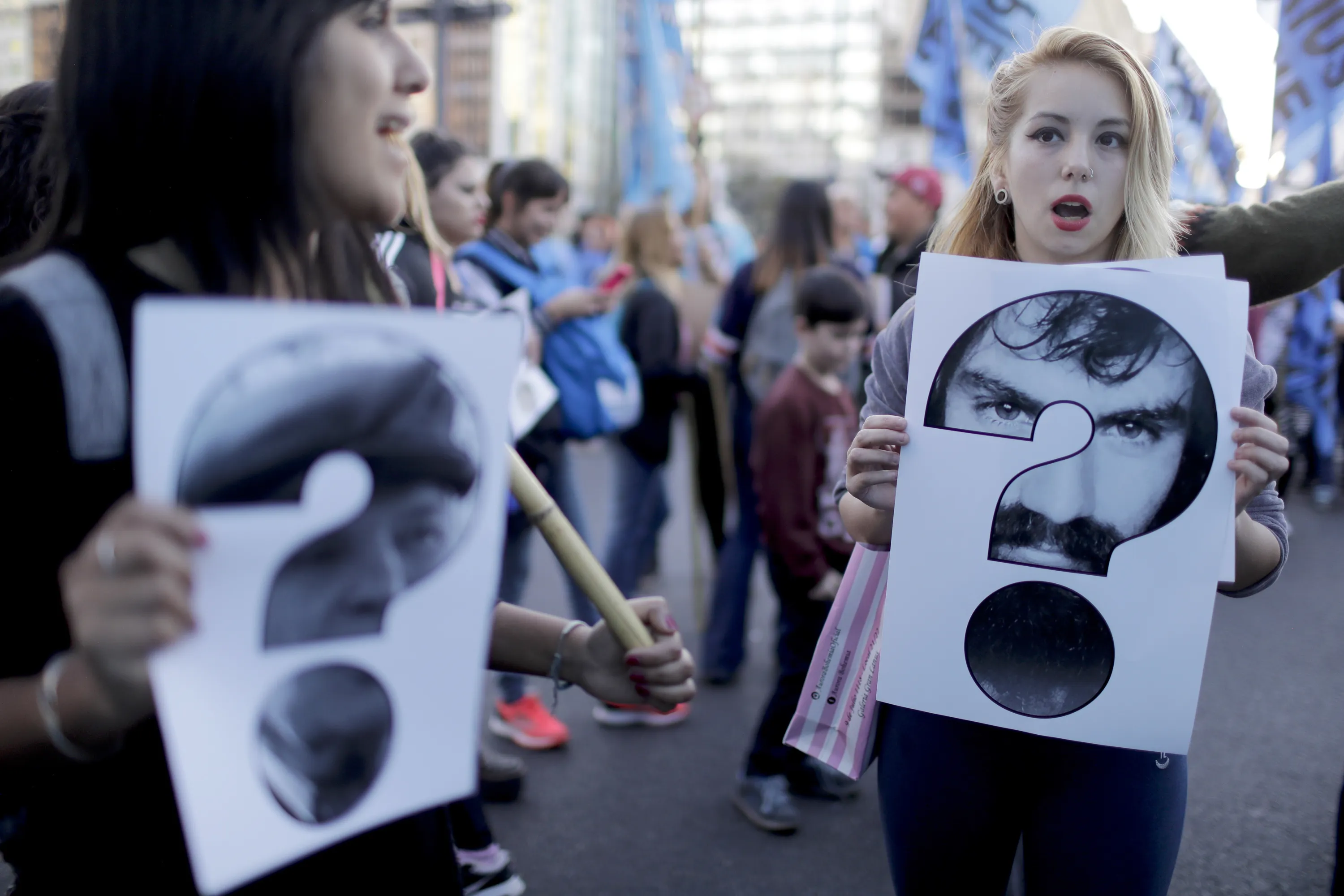 Demonstrators hold pictures of Santiago Maldonado, right, and Julio Lopez, left, during a protest to demand their appearance in Buenos Aires, Argentina, Monday, September 18, 2017. Julio Lopez disappeared 11 years ago, shortly after being a witness on a trail on crimes against humanity and Santiago Maldonado, who disappeared Aug. 1, 2017. (Photo by Natacha Pisarenko/AP Photo)