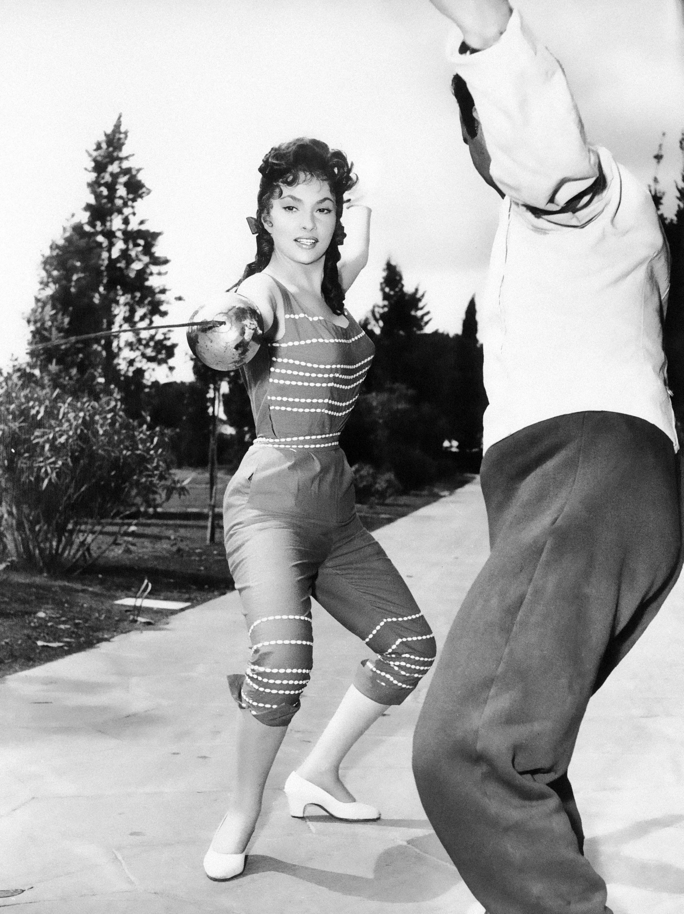 Italian film star Gina Lollobrigida practices fencing under guidance of an instructor during a day off from her filming in Rome, June 3, 1955. She is also taking instruction in gymnastics for relaxation and to help keep a firm control over her famous figure. (Photo by AP Photo)