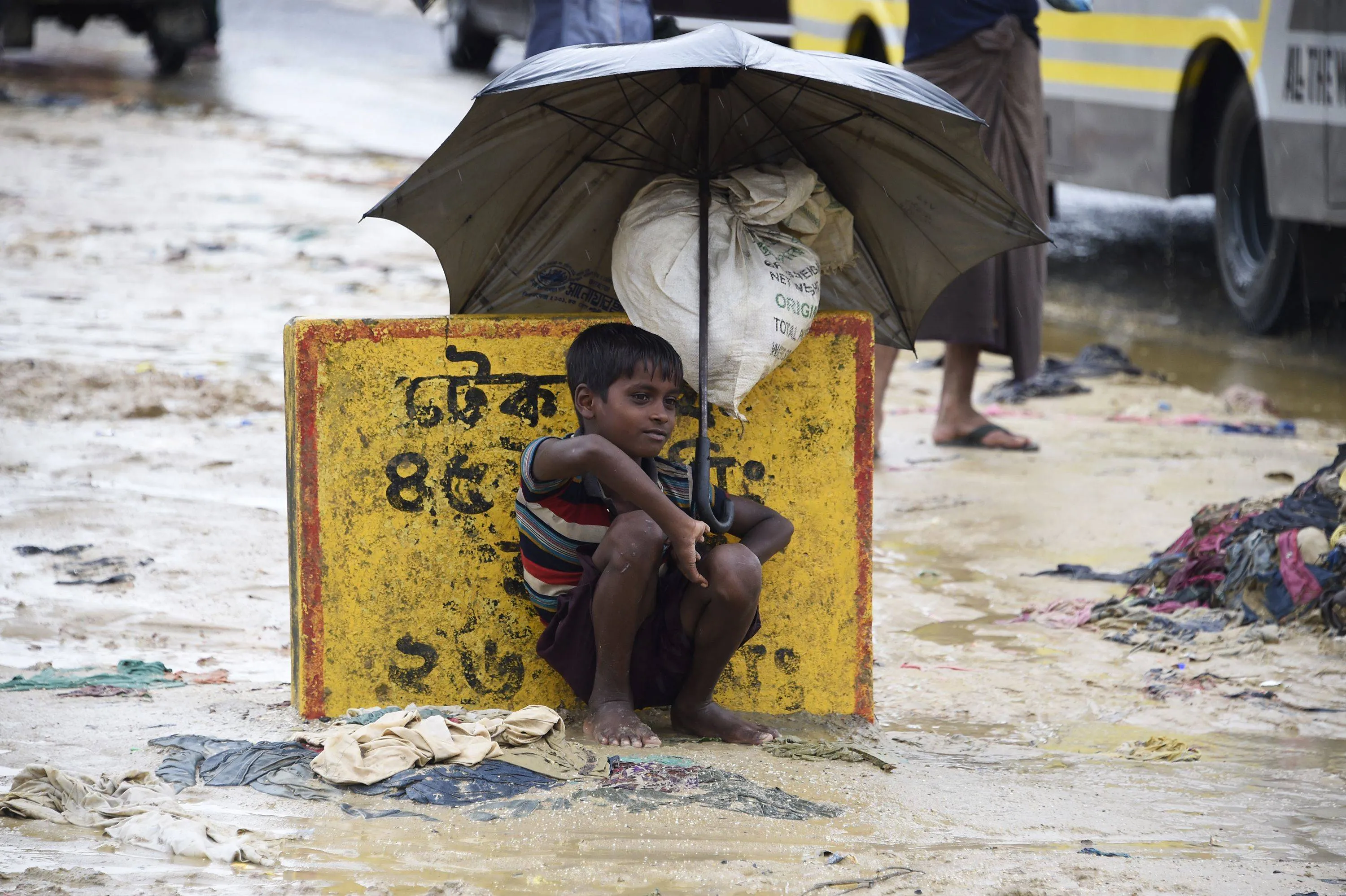 A young Rohingya refugee shelters from the rain with an umbrella while sitting at Kutupalong refugee camp in the Bangladeshi locality of Ukhia on September 19, 2017. Pressure grew on Myanmar on September 18 as a rights group urged world leaders to impose sanctions on its military, which is accused of driving out more than 410,000 Rohingya Muslims in an orchestrated “ethnic cleansing” campaign. (Photo by Dominique Faget/AFP Photo)
