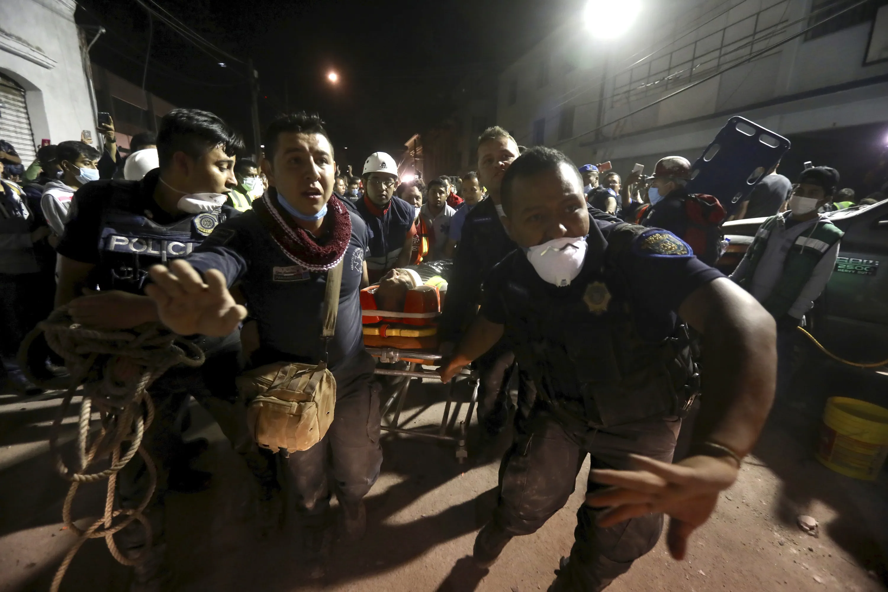 An injured person is carried after being rescued from the rubble of a building that collapsed after an earthquake, in the Colonia Obrera neighborhood of Mexico City, Tuesday, September 19, 2017. A magnitude 7.1 earthquake has stunned central Mexico, killing at least more than 100 people as buildings collapsed in plumes of dust. Thousands fled into the streets in panic, and many stayed to help rescue those trapped. (Photo by Miguel Tovar/AP Photo)