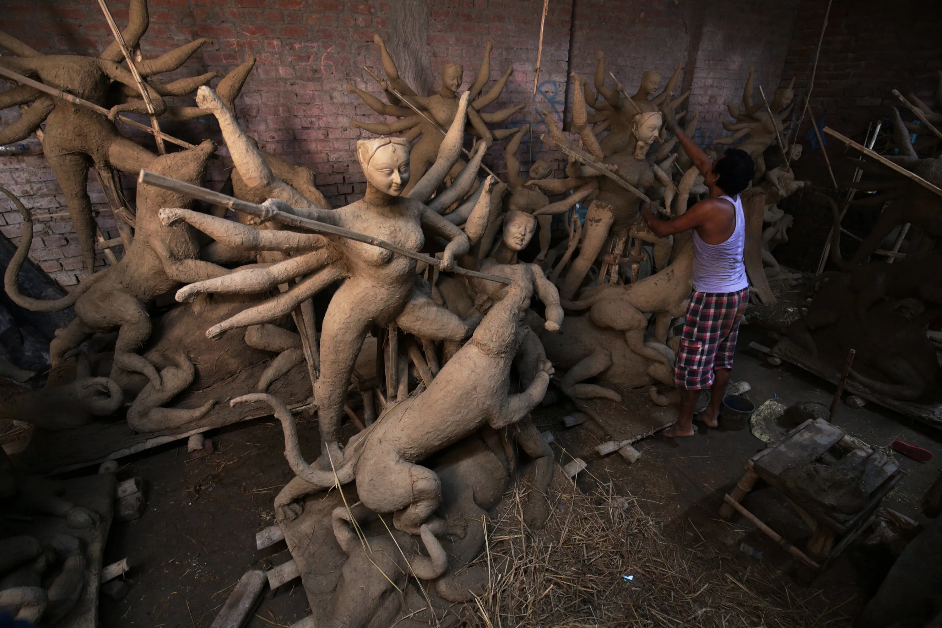Bengali Indian artist Shiv Kumar works on making clay idols of Goddess Durga at his home workshop for sale ahead of the Durga Puja festival in Amritsar, India, 11 September 2017. Bengalis all over the world will be marking the Durga Puja festival, representing the victory of good over evil and the celebration of female power, from 26 to 30 September 2017. (Photo by Raminder Pal Singh/EPA/EFE)