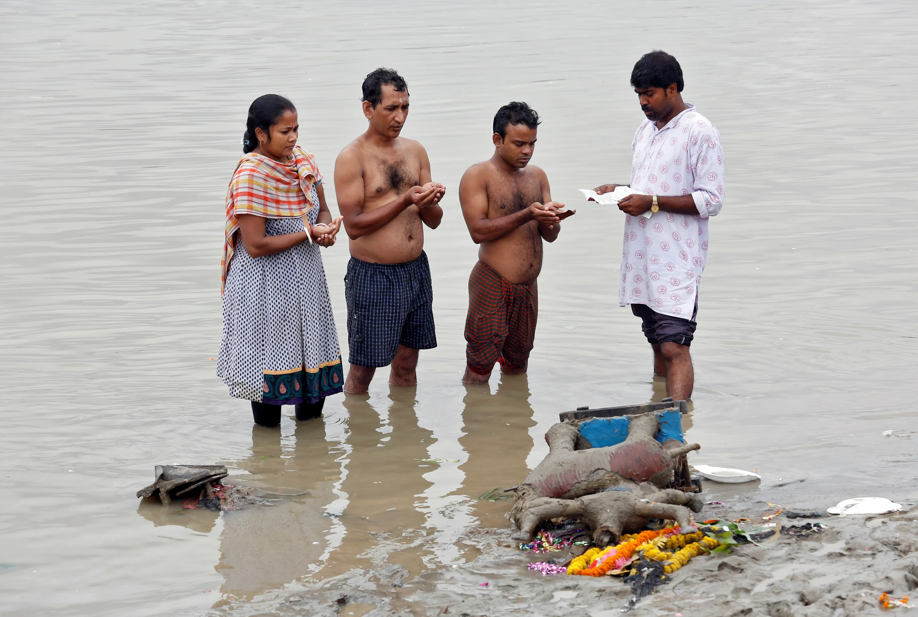 A Hindu priest (R) performs Tarpana, a religious ritual, as he helps a family to pray on the banks of the Ganges river to honour the souls of their departed ancestors during the auspicious day of Mahalaya in Kolkata, September 19, 2017. (Photo by Rupak De Chowdhuri/Reuters)