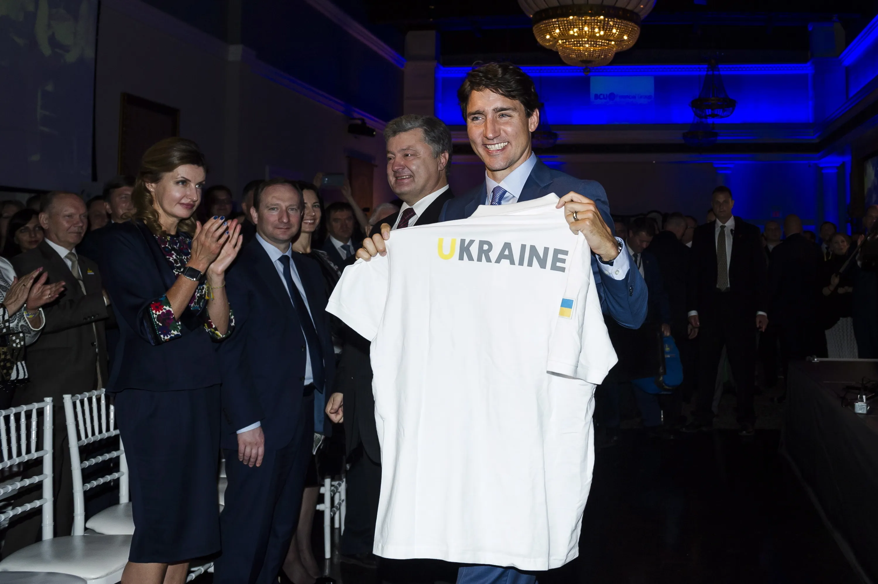 Prime Minister Justin Trudeau receives a gift from President of Ukraine, Petro Poroshenko during the Ukrainian Canadian Congress Invictus Gala, held in Toronto on Friday, September 22, 2017. (Photo by Christopher Katsarov/The Canadian Press via AP Photo)
