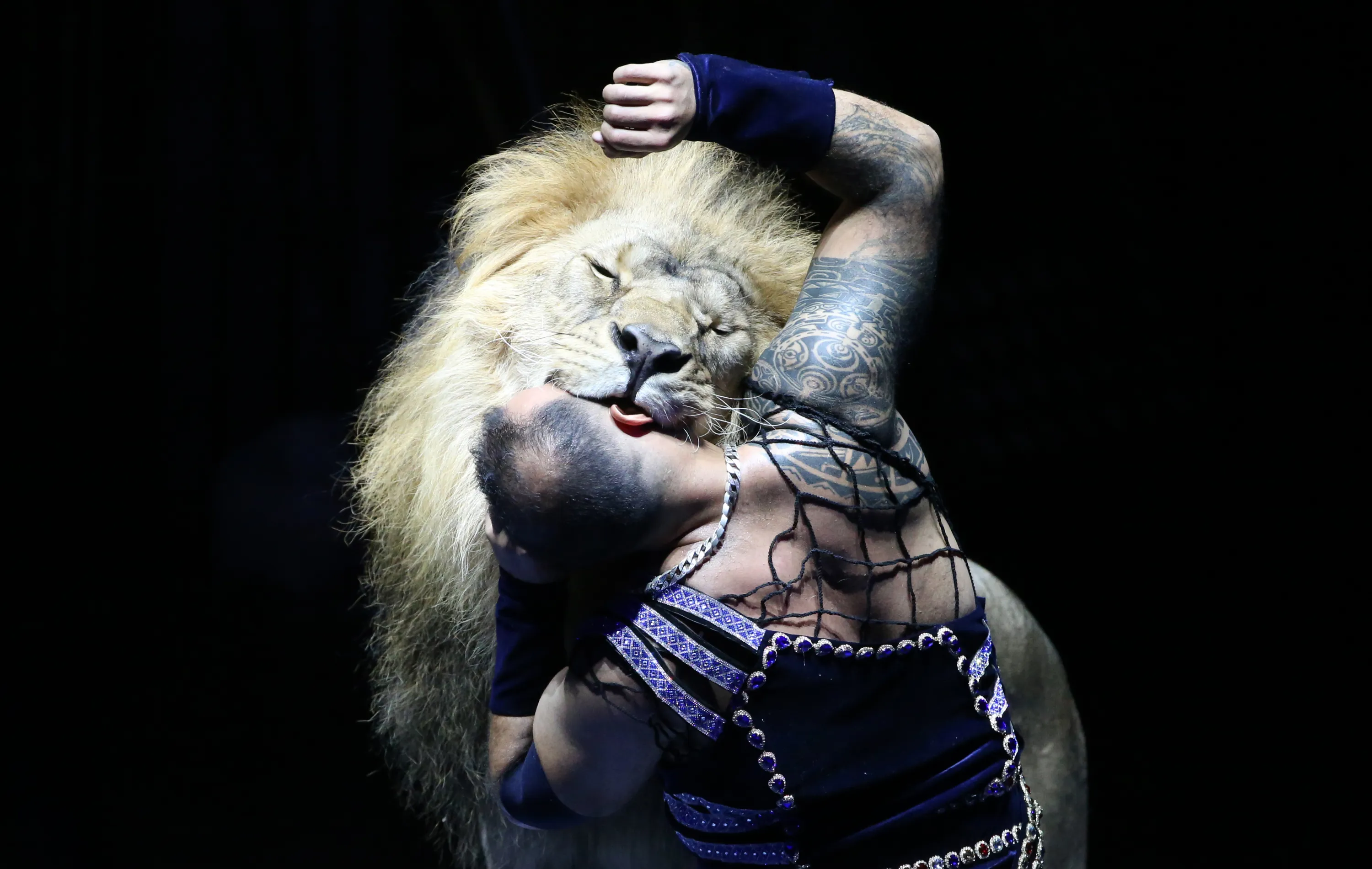 An artist with a lion perform during the first Minsk International Circus Art Festival in Minsk, Belarus, late 21 September 2017. Participants from 16 countries took part in the event. (Photo by Tatyana Zenkovich/EPA/EFE)
