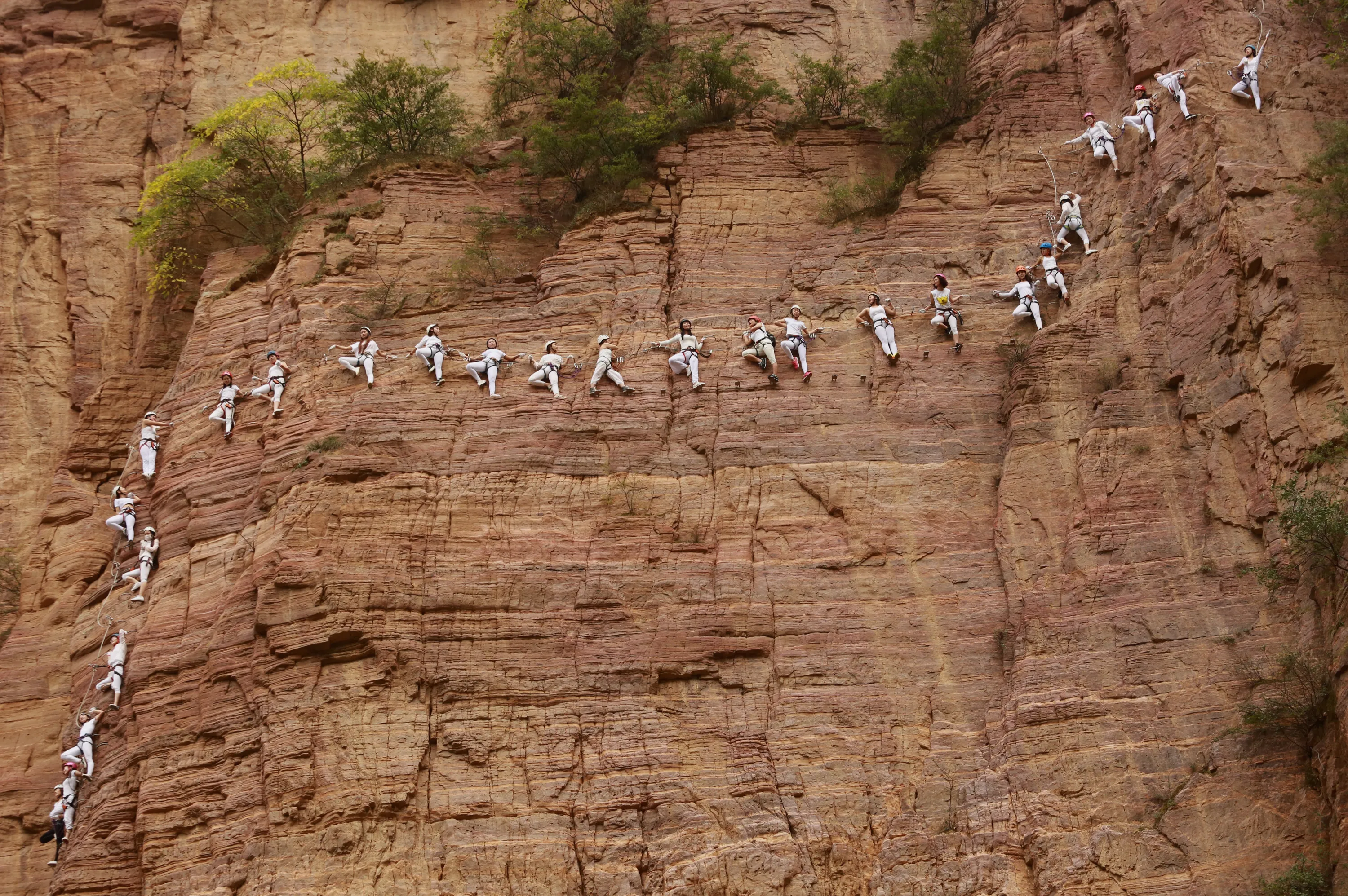 Women hanging on wires perform yoga next to the cliff of Qingyao Mountain on September 23, 2017 in Luoyang, Henan Province of China. (Photo by VCG/VCG via Getty Images)