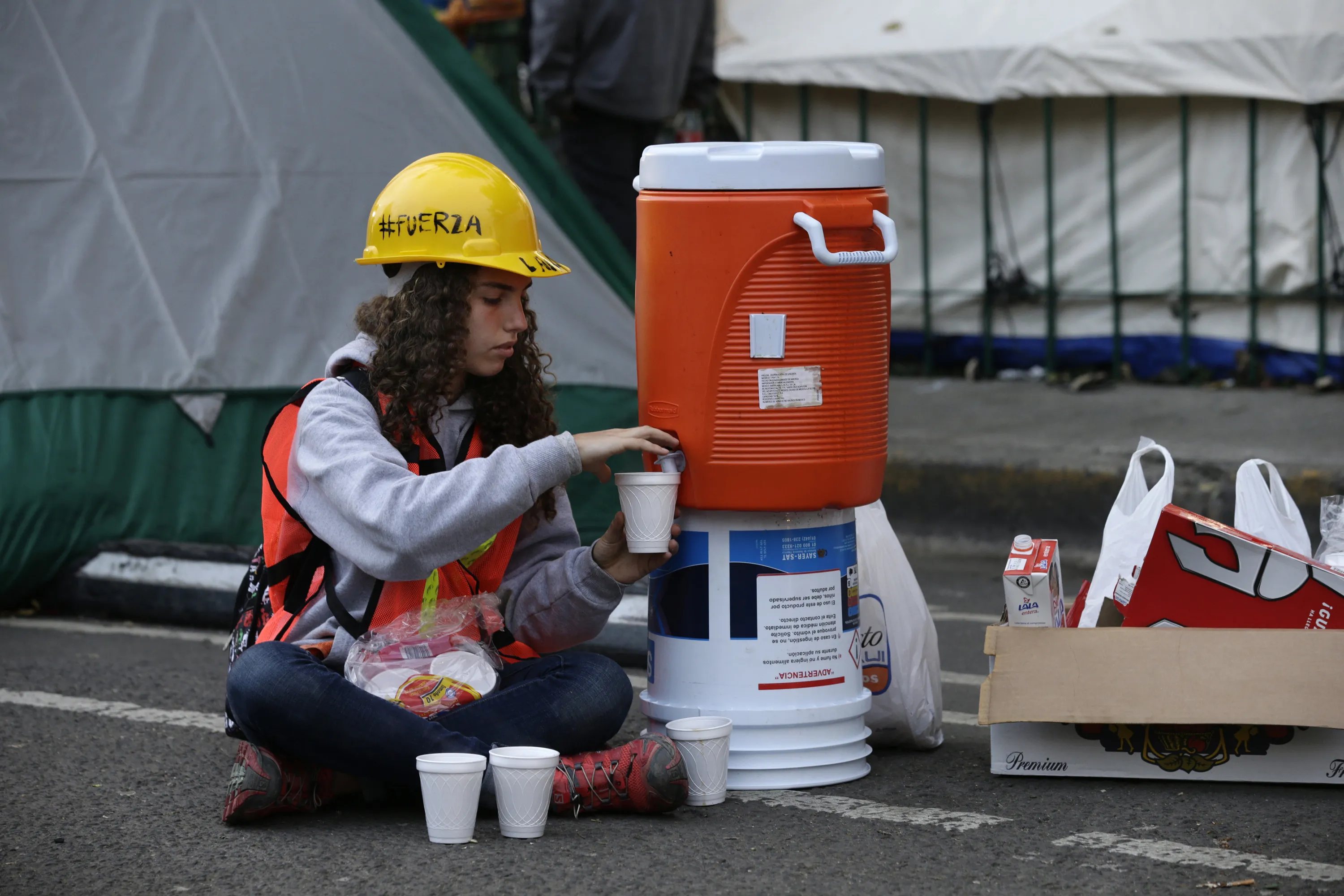 A volunteer fills cups with coffee on the periphery of search and rescue site of a felled office building brought down by a 7.1-magnitude earthquake, in the Roma Norte neighborhood of Mexico City, Sunday, September 24, 2017. As rescue operations stretched into day 6, residents throughout the capital have held out hope that dozens still missing might be found alive. (Photo by Marco Ugarte/AP Photo)
