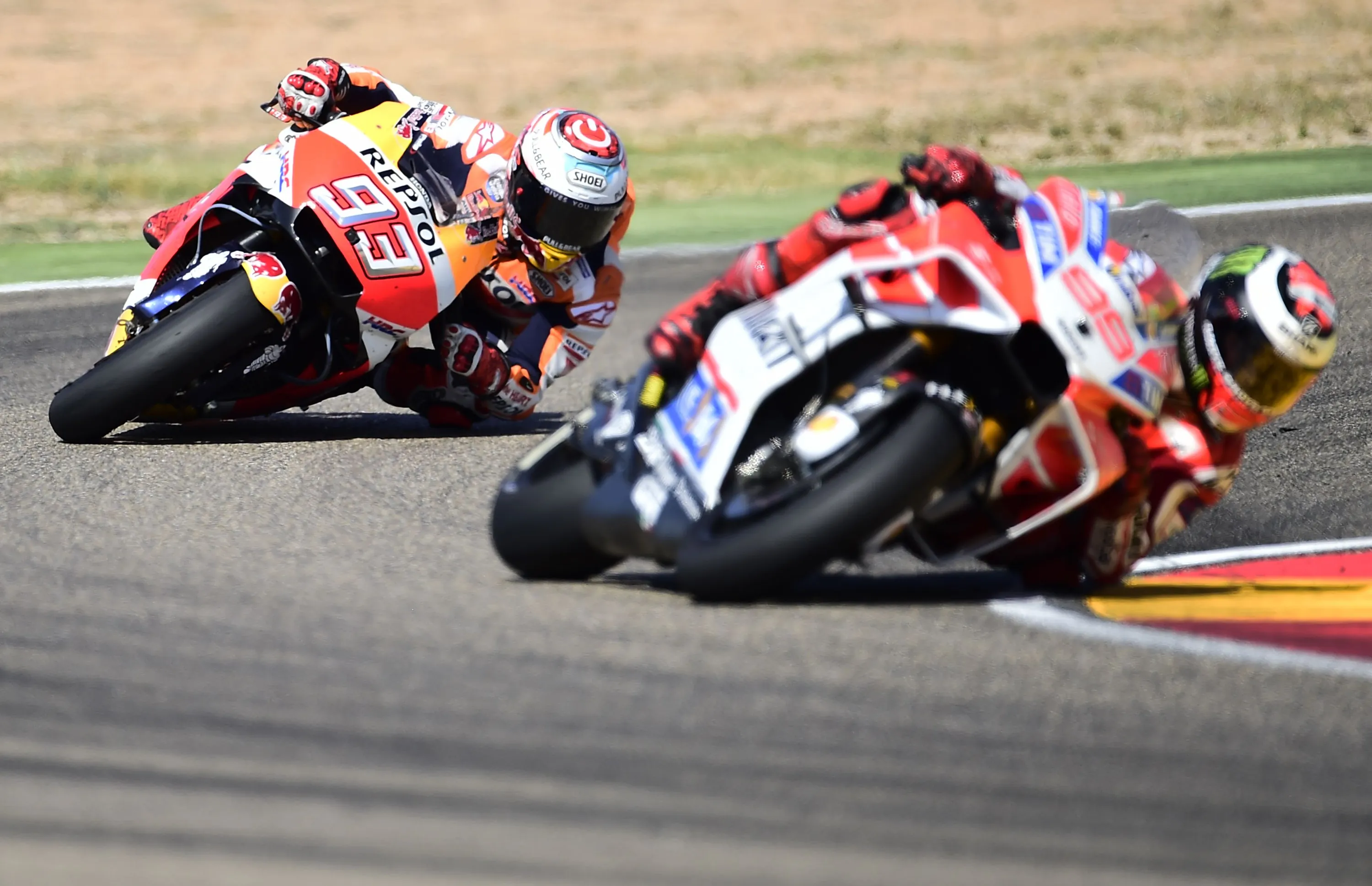 Ducati Team's Spanish rider Jorge Lorenzo (R) and Repsol Honda Team's Spanish rider Marc Marquez ride during MotoGP race of the Moto Grand Prix of Aragon at the Motorland circuit in Alcaniz on September 24, 2017. (Photo by Jose Jordan/AFP Photo)