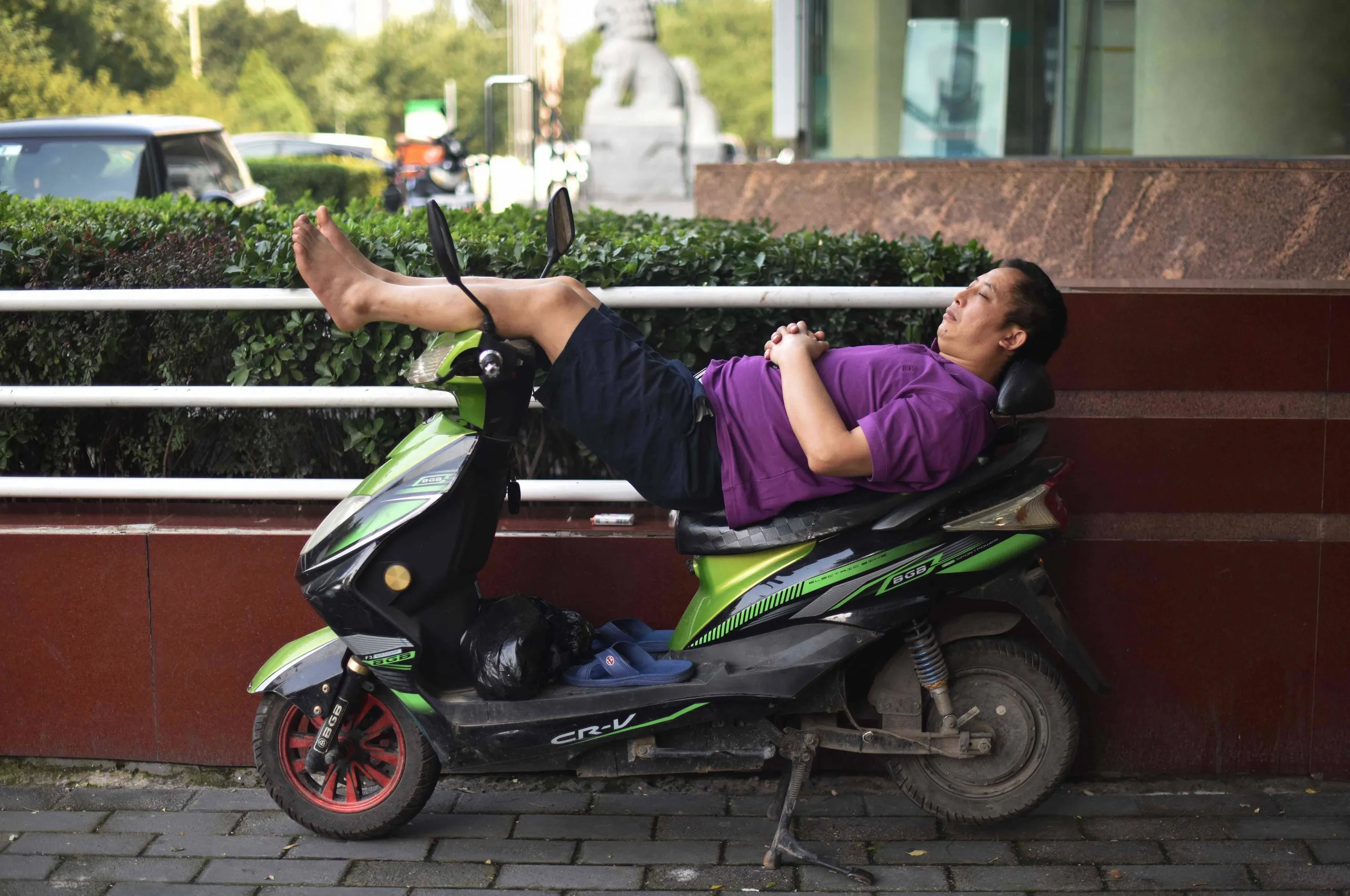A man sleeps on an electric scooter on a sidewalk in Beijing on August 30, 2017. (Photo by Greg Baker/AFP Photo)