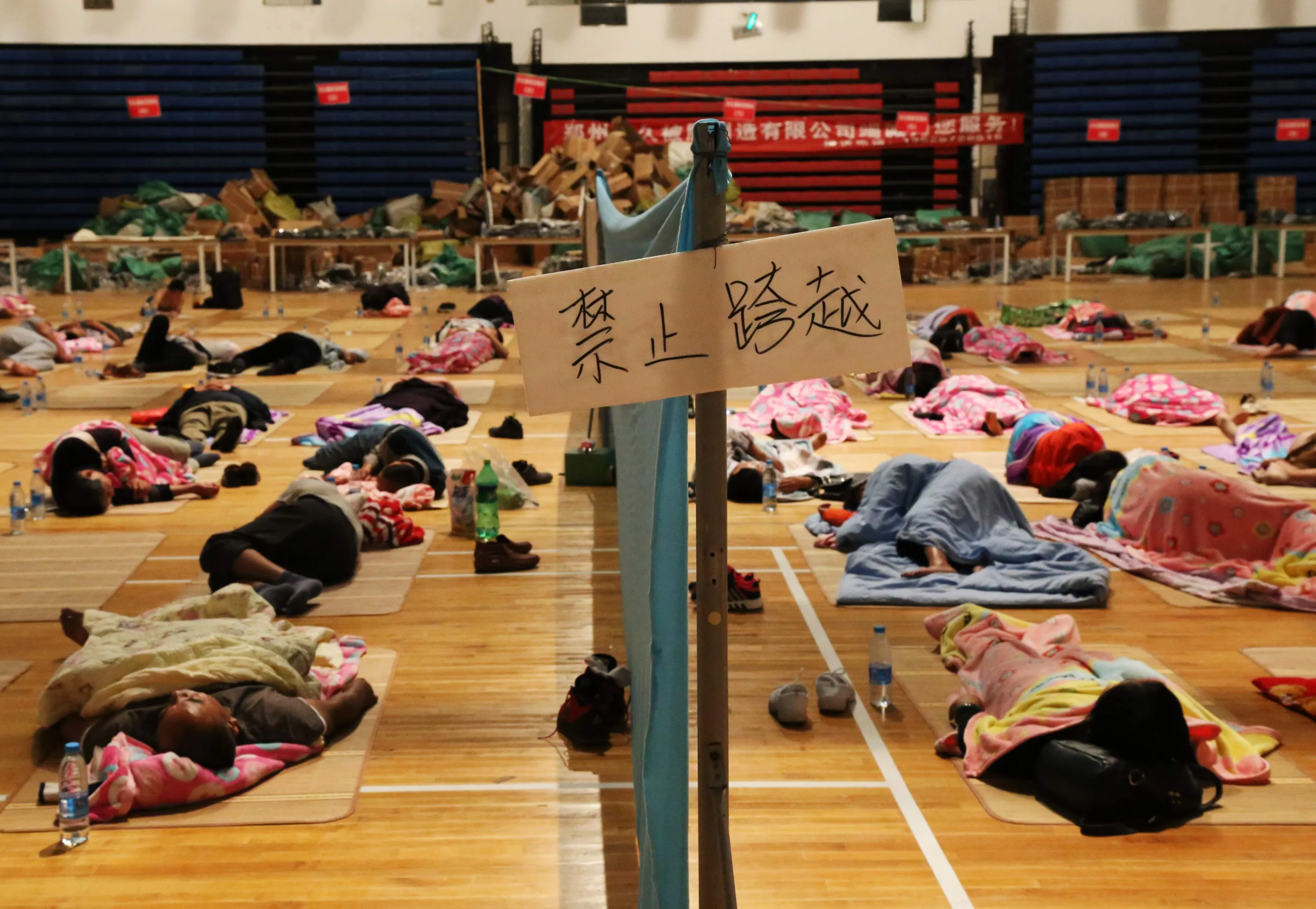 This photo taken on September 2, 2017 shows a sign forbidding crossing the rest area between men and women in a gymnasium at Zhengzhou University in Zhengzhou in China's central Henan province. Some 200 mats, drinking water and mobile phone chargers were provided by the university to parents who accompanied their children to school for registration at the facility for the start of the school year. (Photo by AFP Photo/Stringer)