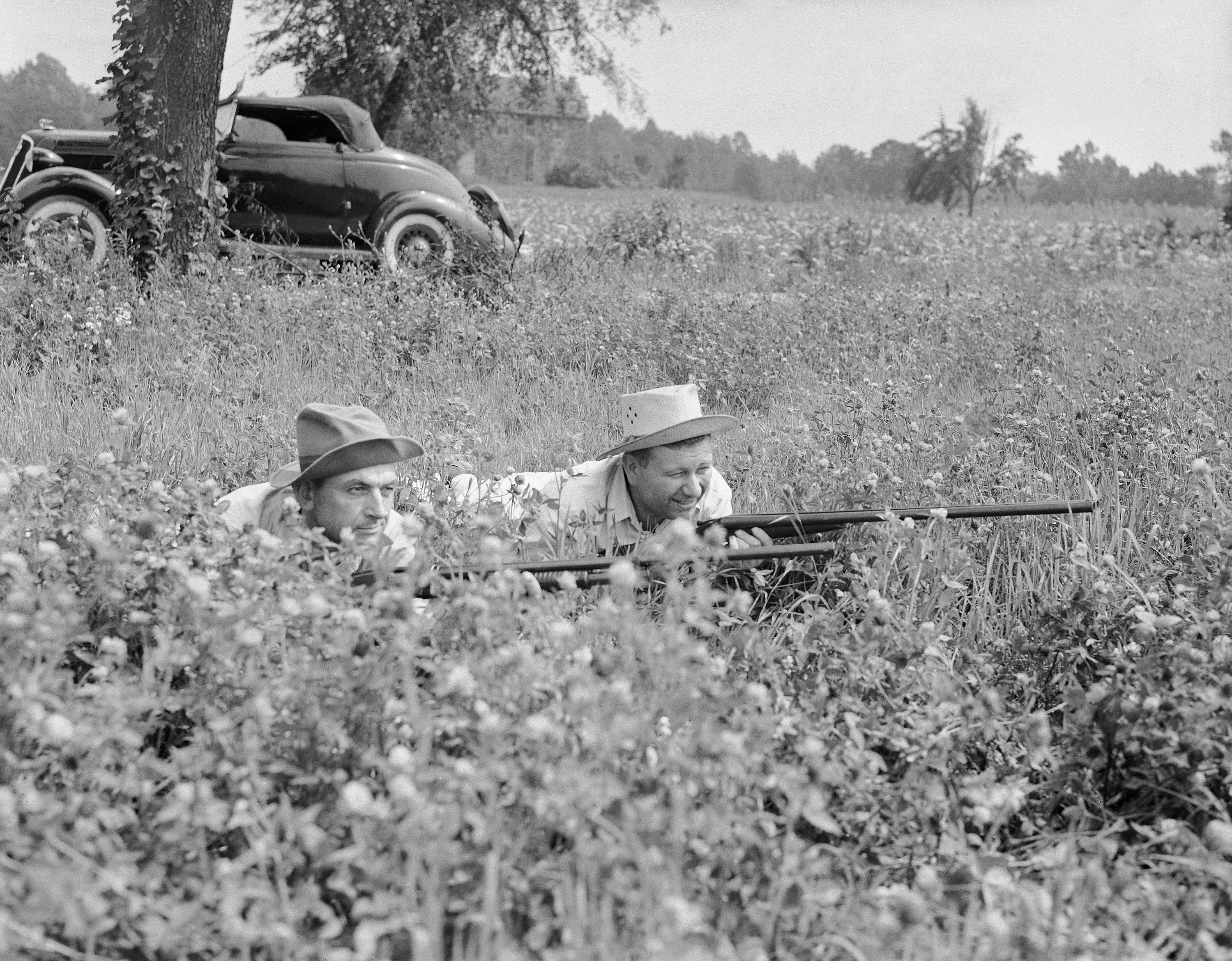 In this July 28, 1942 file photo, two members of the Maryland Minute Men, a civilian defense organization, hold their rifles as they lie low in a southern Maryland hay field during a search for traces of parachutists during World War II. State and federal agencies joined in hunt in Crownsville, Md. (Photo by AP Photo)