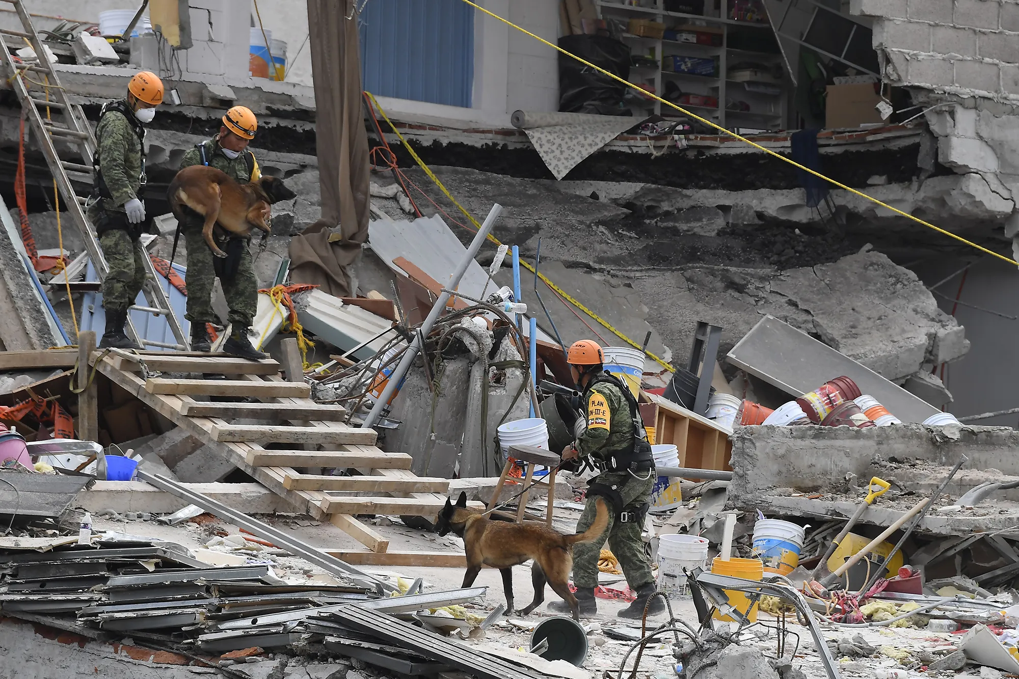 Sniffer dogs take part in the search for survivors at a flattened building in Mexico City in the early hours of the morning on September 24, 2017, five days after the devastating quake that hit central Mexico. (Photo by Omar Torres/AFP Photo)