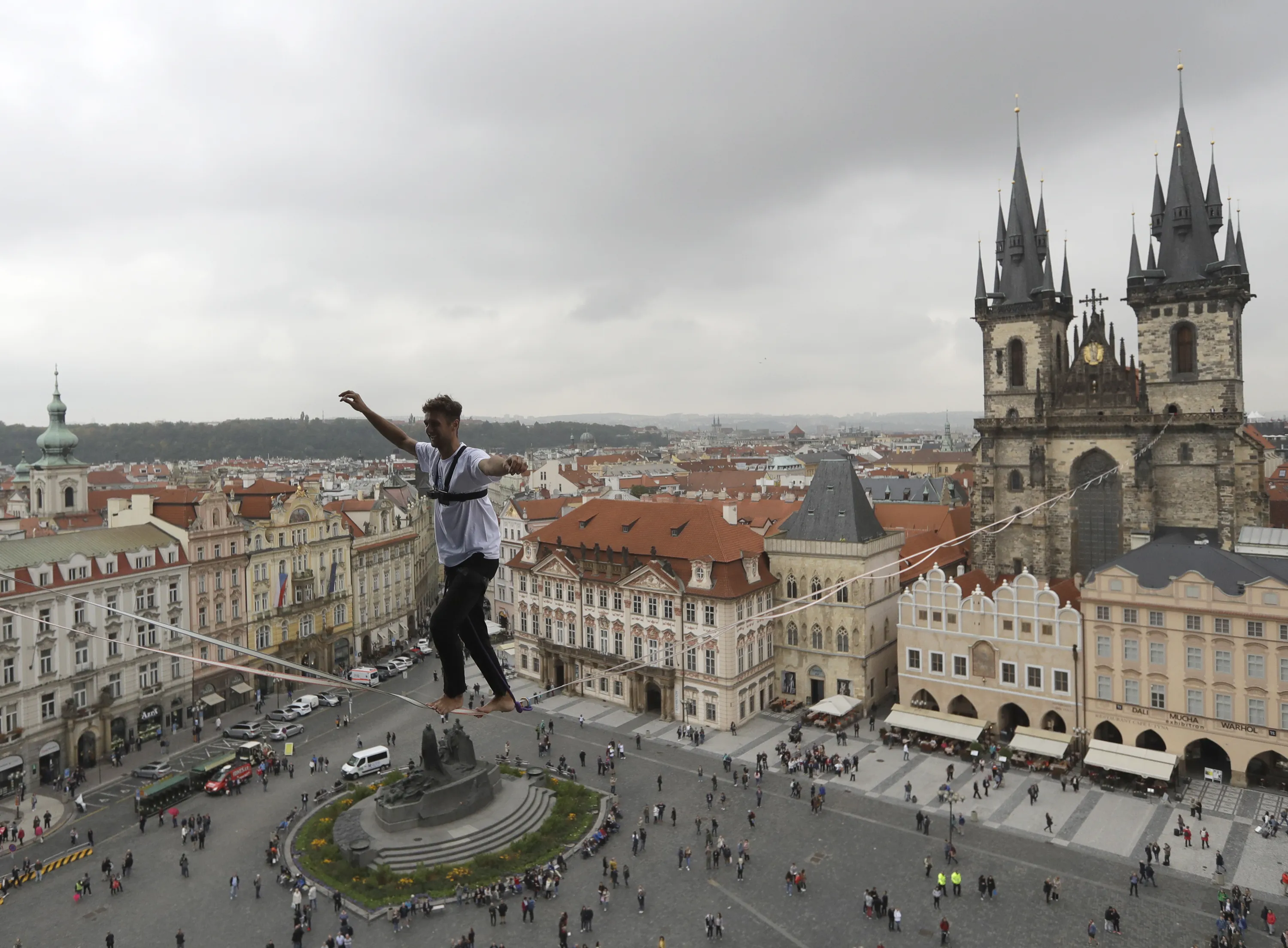An athlete balances on a slackline stretched across the Old Town Square in Prague, Czech Republic, Monday, September 25, 2017. The performance was part of a campaign supporting people living with diabetes. (Photo by Petr David Josek/AP Photo)