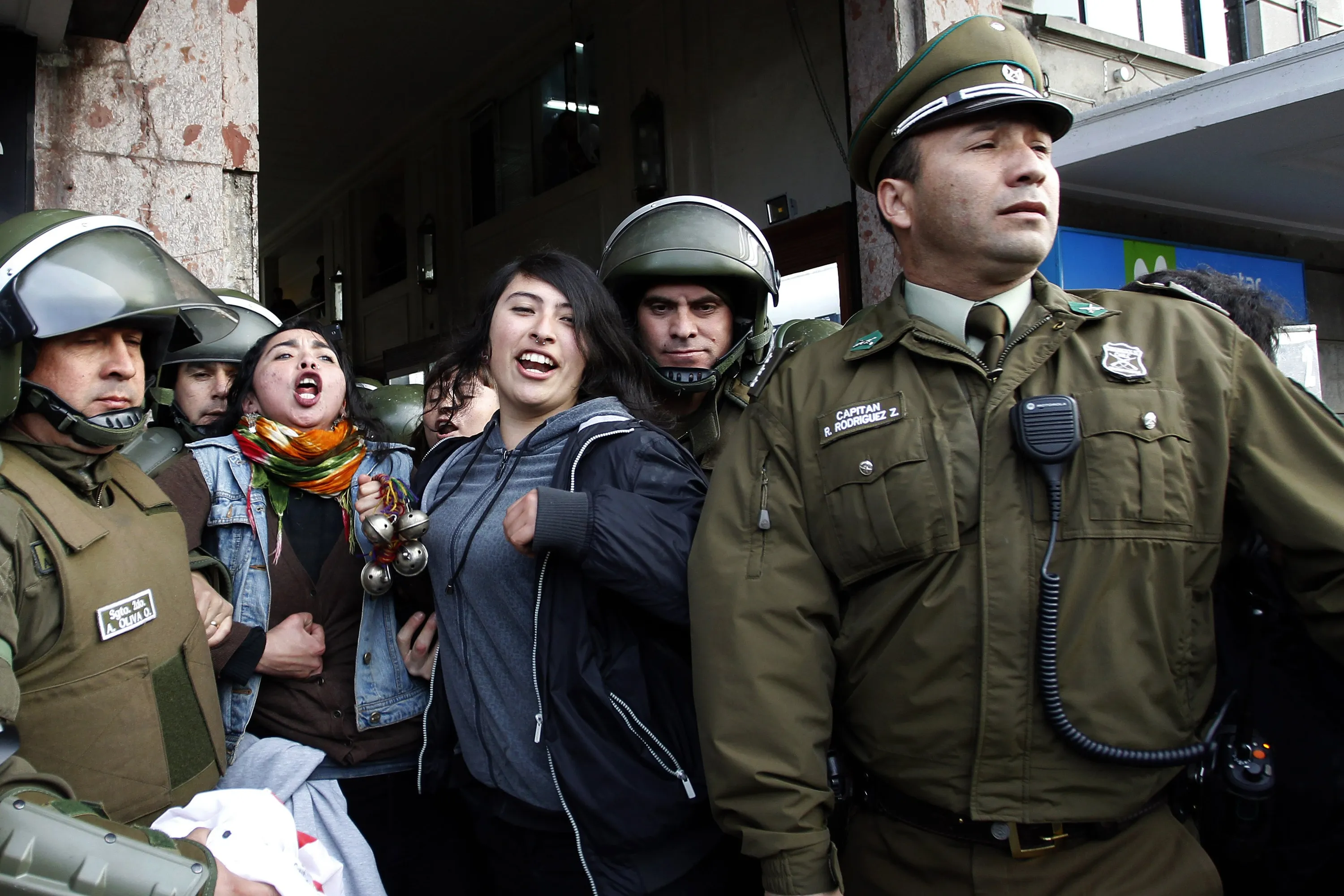 Two young people shout slogans while being detained by police during a demonstration in Concepcion, southern Chile, 25 September 2017. At least 30 activists were detained today after a protest that took place outside the cathedral of Concepcion, southern Chile, in support of four Mapuche activists who have been on hunger strike for 110 days. (Photo by Dragomir Yankovic/EPA/EFE)