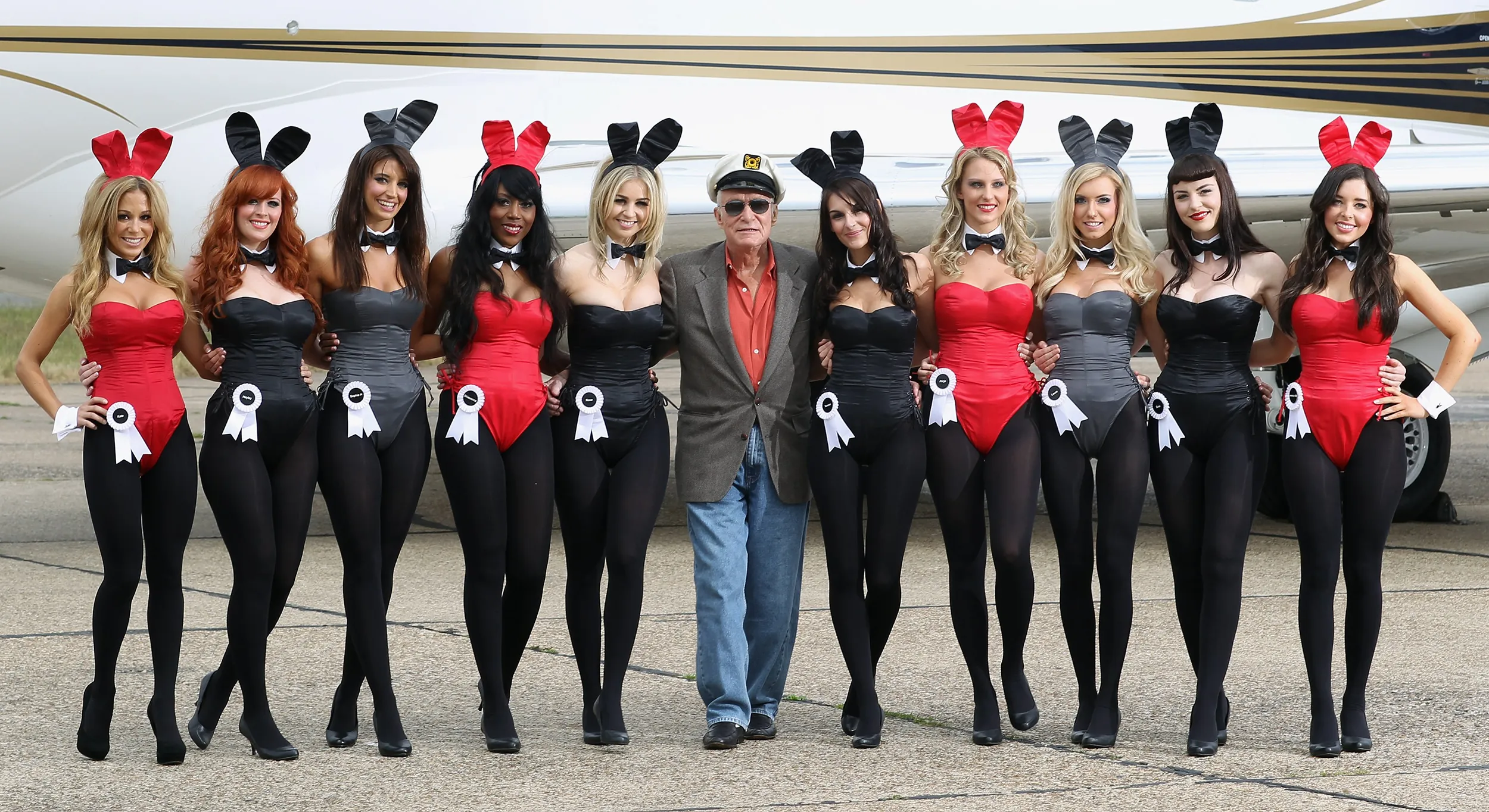 Playboy founder Hugh Hefner (centre) arrives at Stansted Airport on June 2, 2011 in Stansted, England. The photograph is a recreation of a picture originally taken in the 1960's, with ten of the new London Bunnies. Mr Hefner is back in the UK to mark the launch of the new Playboy Club in Mayfair, which opens on June 4. The clubs opening will welcome back the iconic Playboy Bunny to Londonafter a 30 year absence. Famous Bunnies have included Debbie Harry and Lauren Hutton. (Photo by Dan Kitwood/Getty Images)