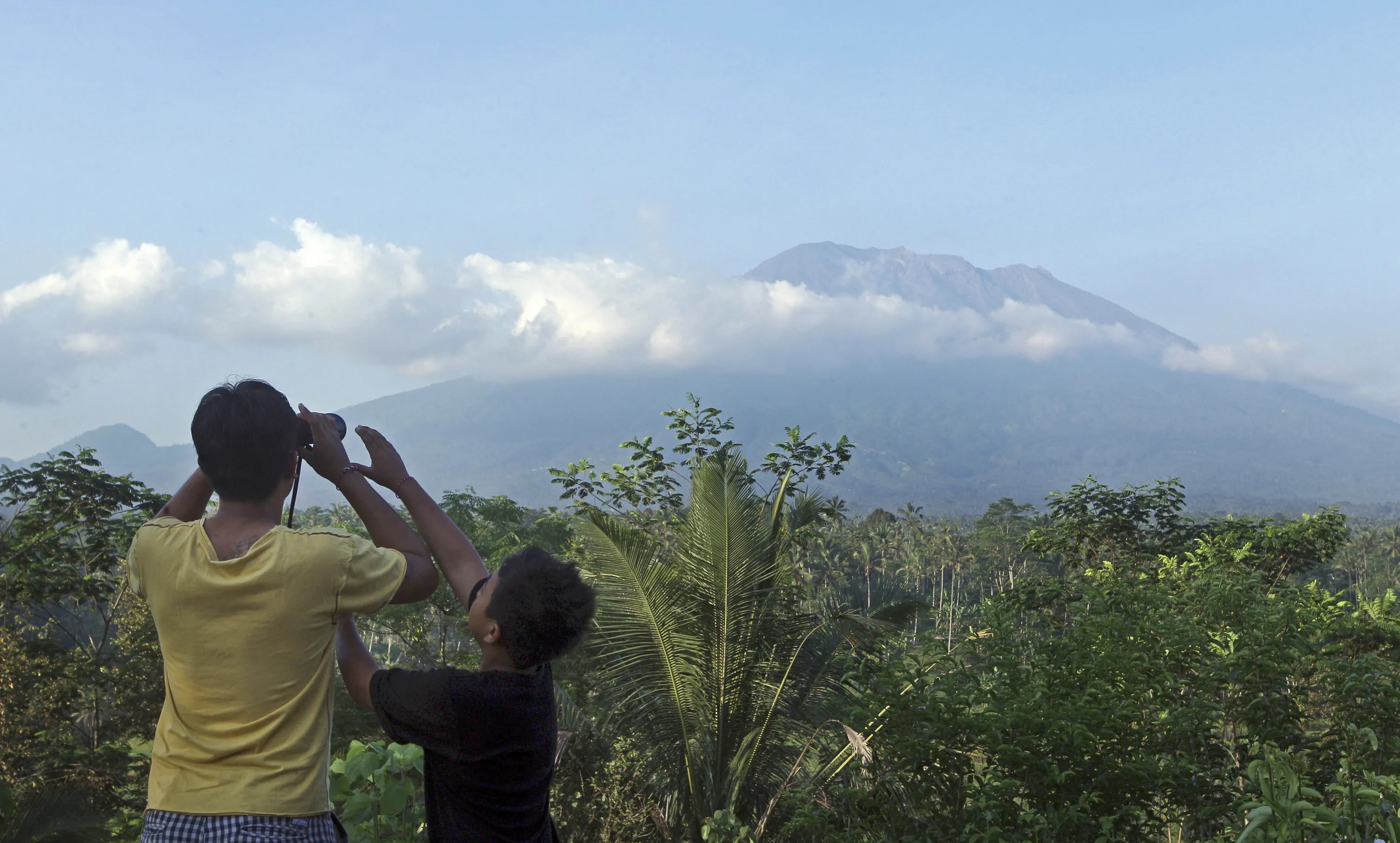 In this September 20, 2017, file photo, a man looks out at Mount Agung with binoculars at an observation point in Bali, Indonesia. Authorities have ordered the evacuation of villagers living within a high danger zone that in places extends 12 kilometers (7.5 miles) from Mount Agung's crater. But people further away are also leaving. (Photo by Firdia Lisnawati/AP Photo)