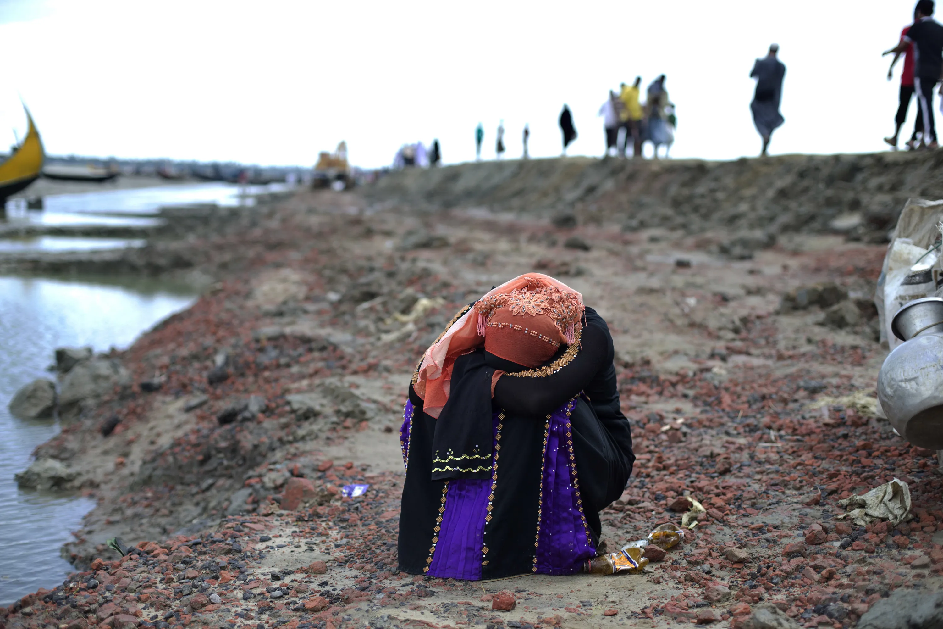 A Rohingya Muslim woman who just crossed the border from Myanmar into Bangladesh puts her head down and cries in Teknaf, Bangladesh, Friday, September 29, 2017. (Photo by Gemunu Amarasinghe/AP Photo)
