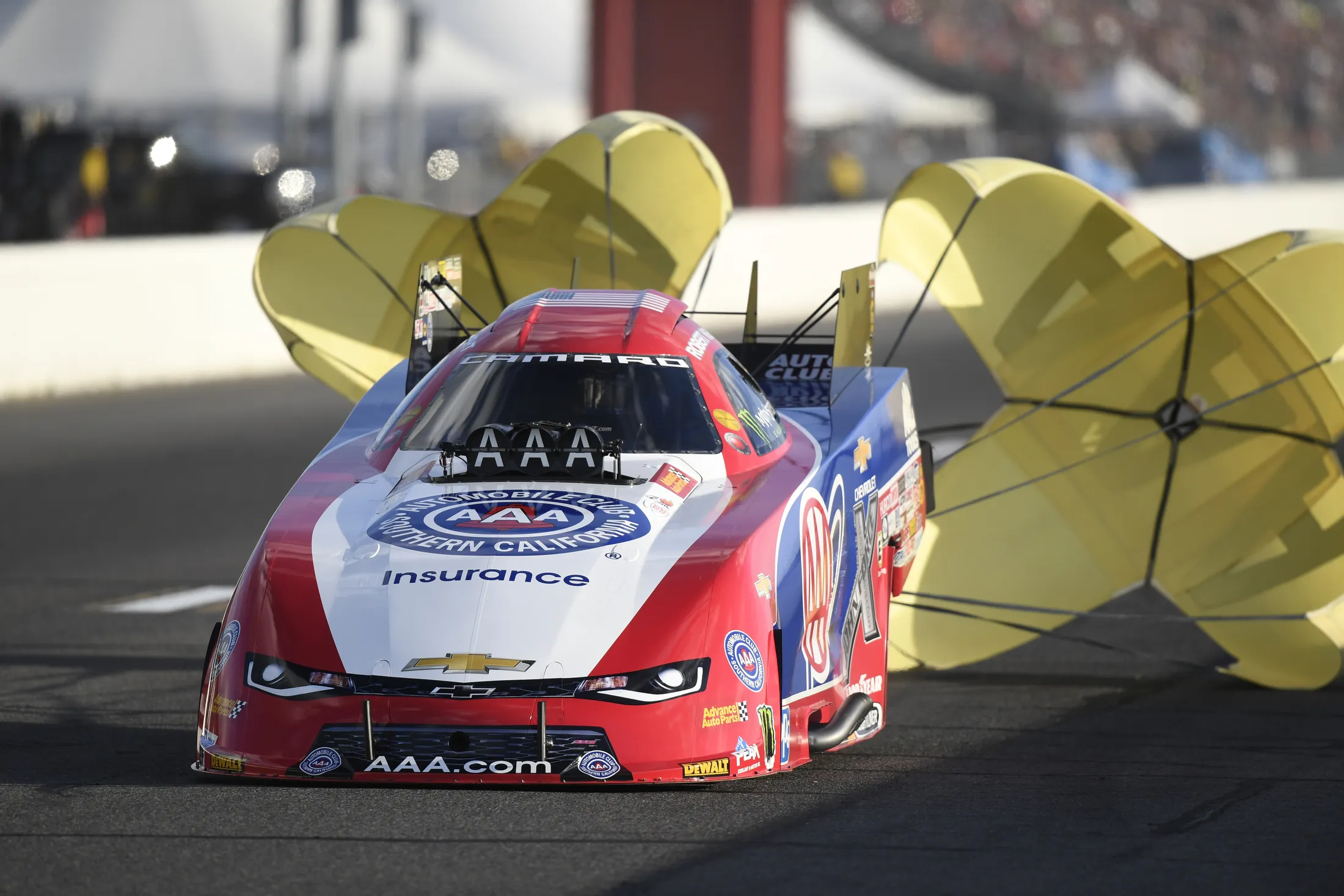 In this photo provided by the NHRA, Robert Hight slows after a run in Funny Car qualifying Friday, September 29,2 017, at the AAA Insurance NHRA Midwest Nationals drag races in Madison, Ill. (Photo by Marc Gewertz/NHRA via AP Photo)