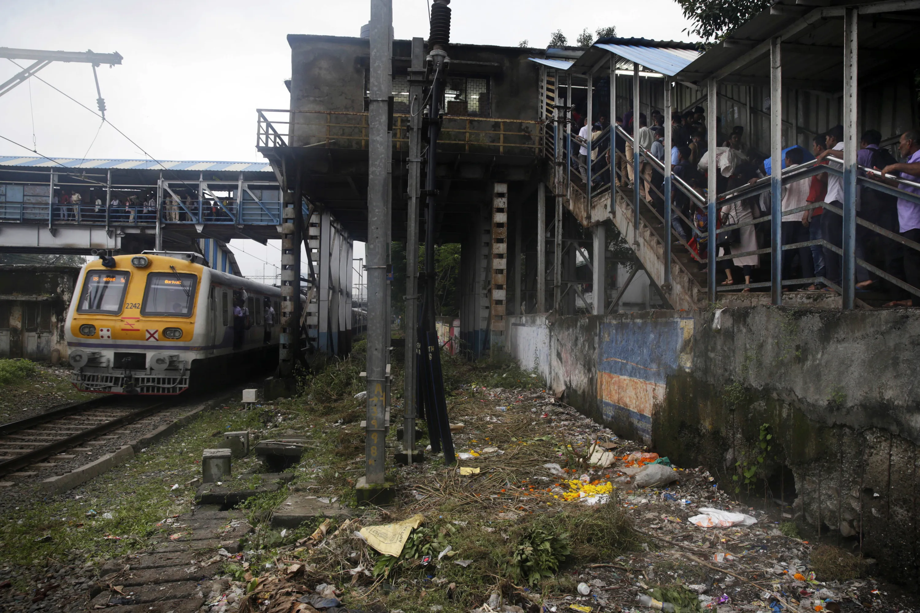 A local train drives past a pedestrian bridge where a stampede occurred earlier in the morning in Mumbai, India, Friday, September 29, 2017. The stampede broke out on a crowded pedestrian bridge connecting two railway stations in Mumbai during the Friday morning rush, killing a number of people police said. (Photo by Rafiq Maqbool/AP Photo)