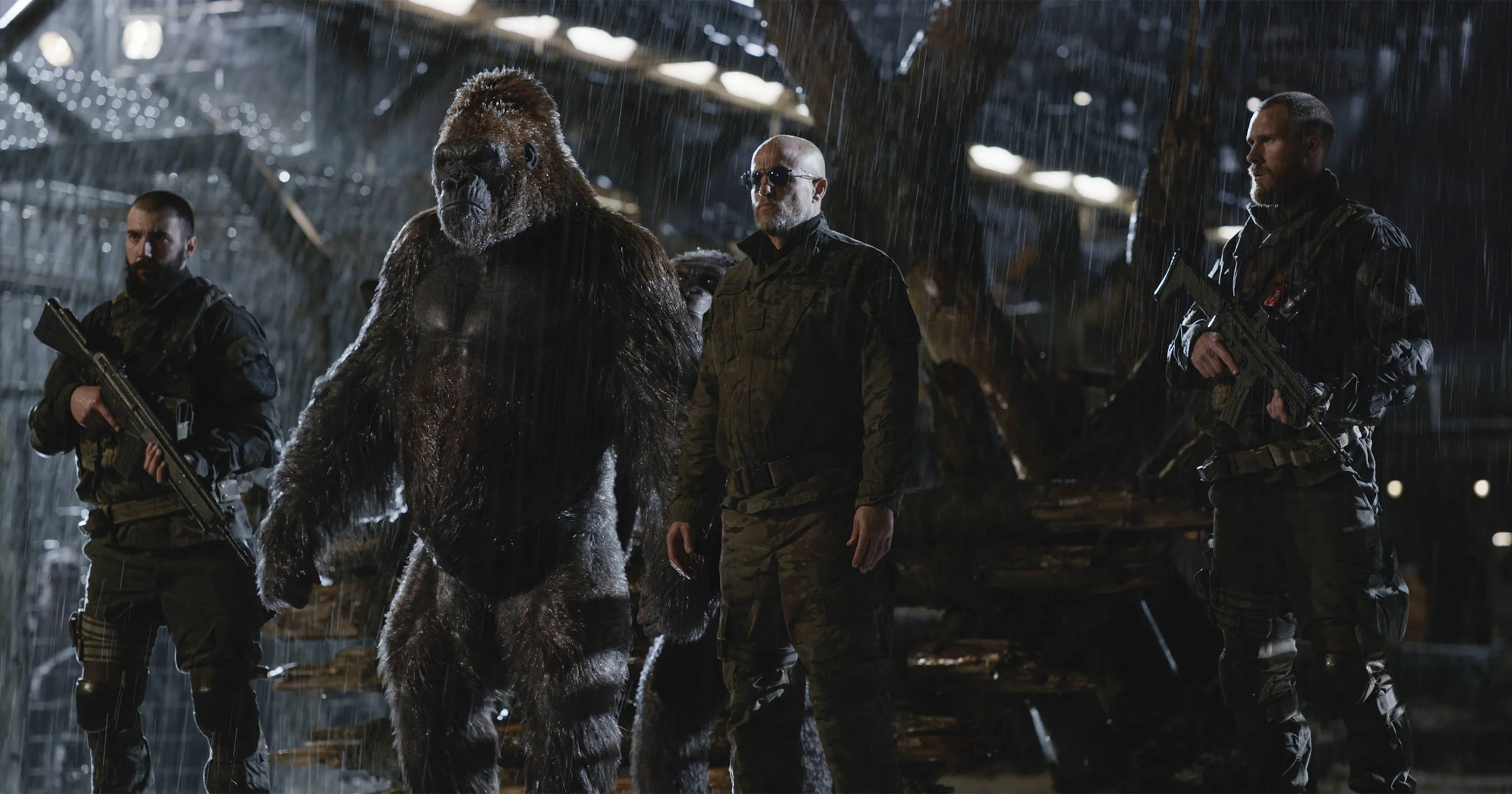 This image released by Twentieth Century Fox shows Woody Harrelson, center, in a scene from “War for the Planet of the Apes”. (Photo by Twentieth Century Fox via AP Photo)