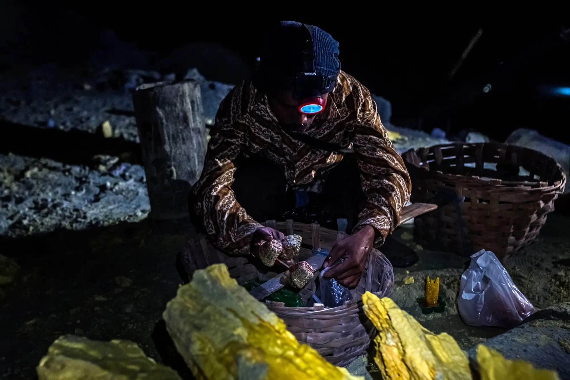 A miner is molding sulfur in turtle or other shapes to sell it to tourists in East Java, Indonesia on September 21, 2017. 150 miners are working in Ijen. Most of the souvenirs cost about 50'000 Rupiah (4 US Dollars). The crater produces 15 tons of fresh sulfur every day. (Photo by Claudio Sieber/Barcroft Images)