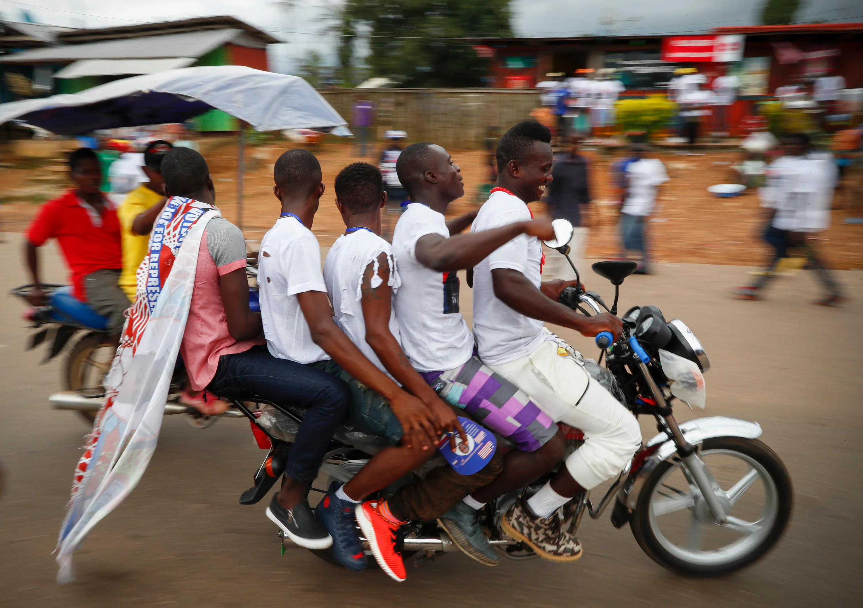 Supporters of Liberian presidential candidate George Weah ride five up, on a motorcycle during a campaign rally in Buchanan, Liberia, 30 September 2017 (issued 01 October 2017). Liberians will head to the polls on 10 October in the very first African nation to obtain independence in 1847. These elecions are hoped to be the first peaceful and democratic transfer of power from Africa's first woman democratically elected president, Ellen Johnson-Sirleaf to a new leader who has to continue in the efforts to rebuilding the country, following nearly two decades of brutal civil war. (Photo by Nic Bothma/EPA/EFE)