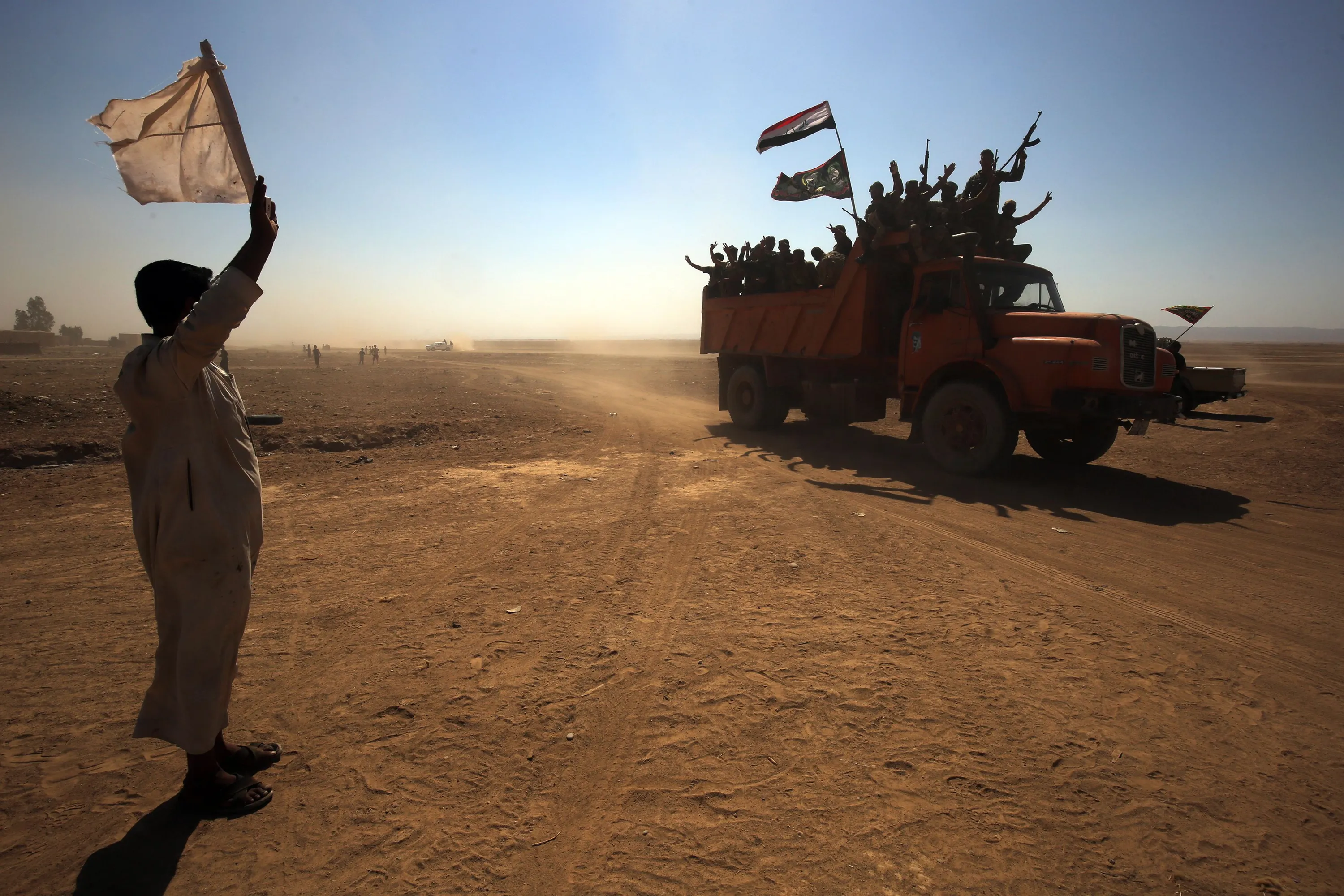 An Iraqi man, from a neighbouring village, waves a white flag as Iraqi forces and fighters from the Hashed al-Shaabi (Popular Mobilisation units) advance towards the Islamic State (IS) group's stronghold of Hawija on October 1, 2017 in their ongoing battle to recapture the town from the jihadists. (Photo by Ahmad Al-Rubaye/AFP Photo)