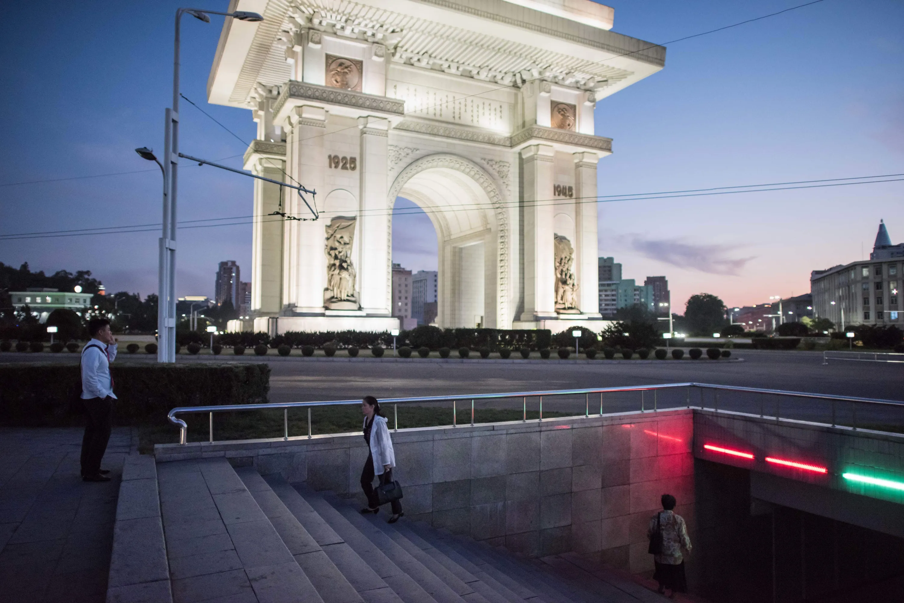 Pedestrians exit a subway before the Arch of Triumph in Pyongyang, North Korea on September 20, 2017. (Photo by Ed Jones/AFP Photo)