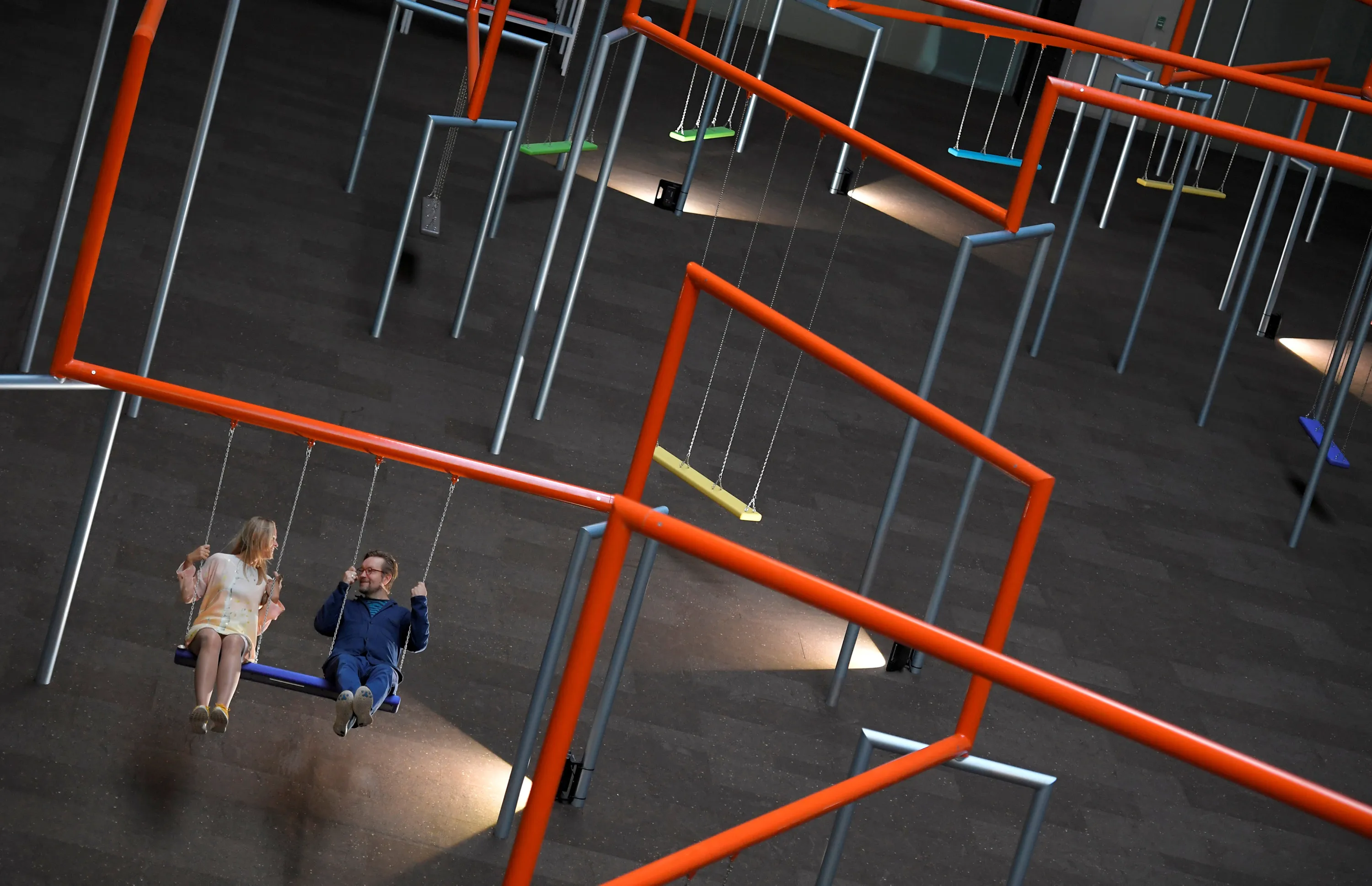 Two visitors ride on swings which form part of the new installation “One Two Three Swing!” by Danish art collective SUPERFLEX, at the Tate Modern in London, Britain, October 2, 2017. (Photo by Toby Melville/Reuters)