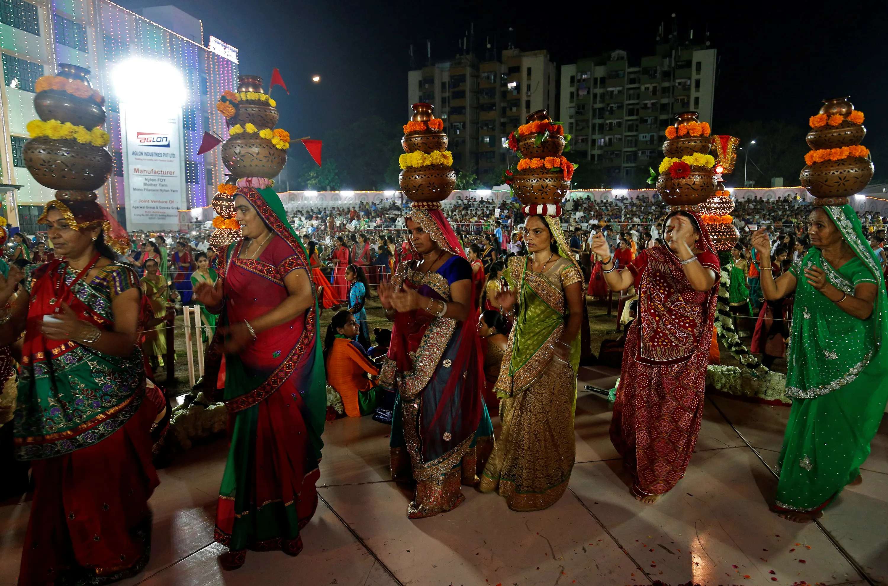 Hindu devotees perform Garba, a traditional folk dance, during the celebrations to mark the Navratri festival, in which devotees worship Hindu goddess Durga, at Surat in the western state of Gujarat, India, September 28, 2017. (Photo by Amit Dave/Reuters)