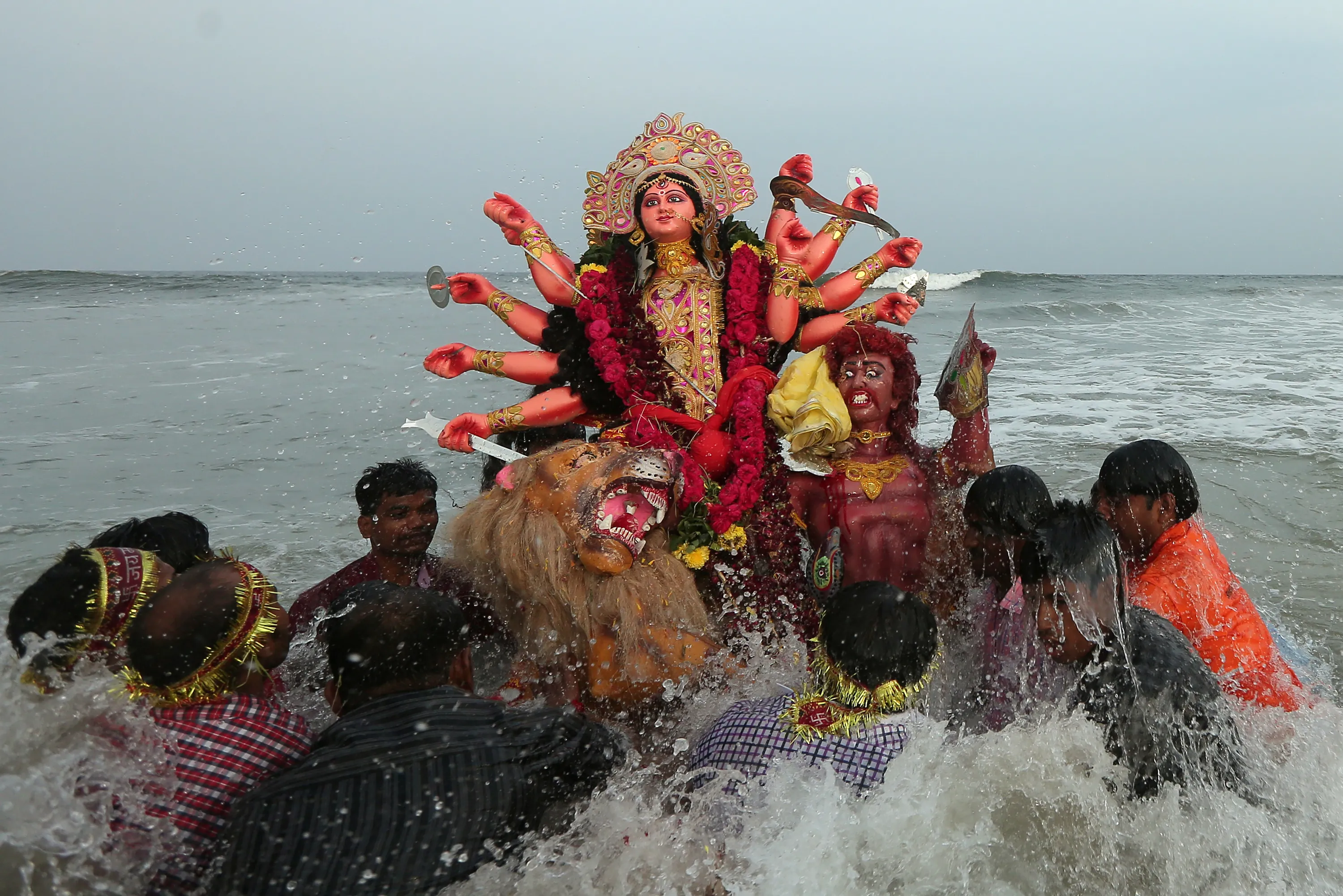 Devotees immerse an idol of the Hindu goddess Durga into the Bay of Bengal on the last day of the Durga Puja festival in Chennai, September 30, 2017. (Photo by P. Ravikumar/Reuters)