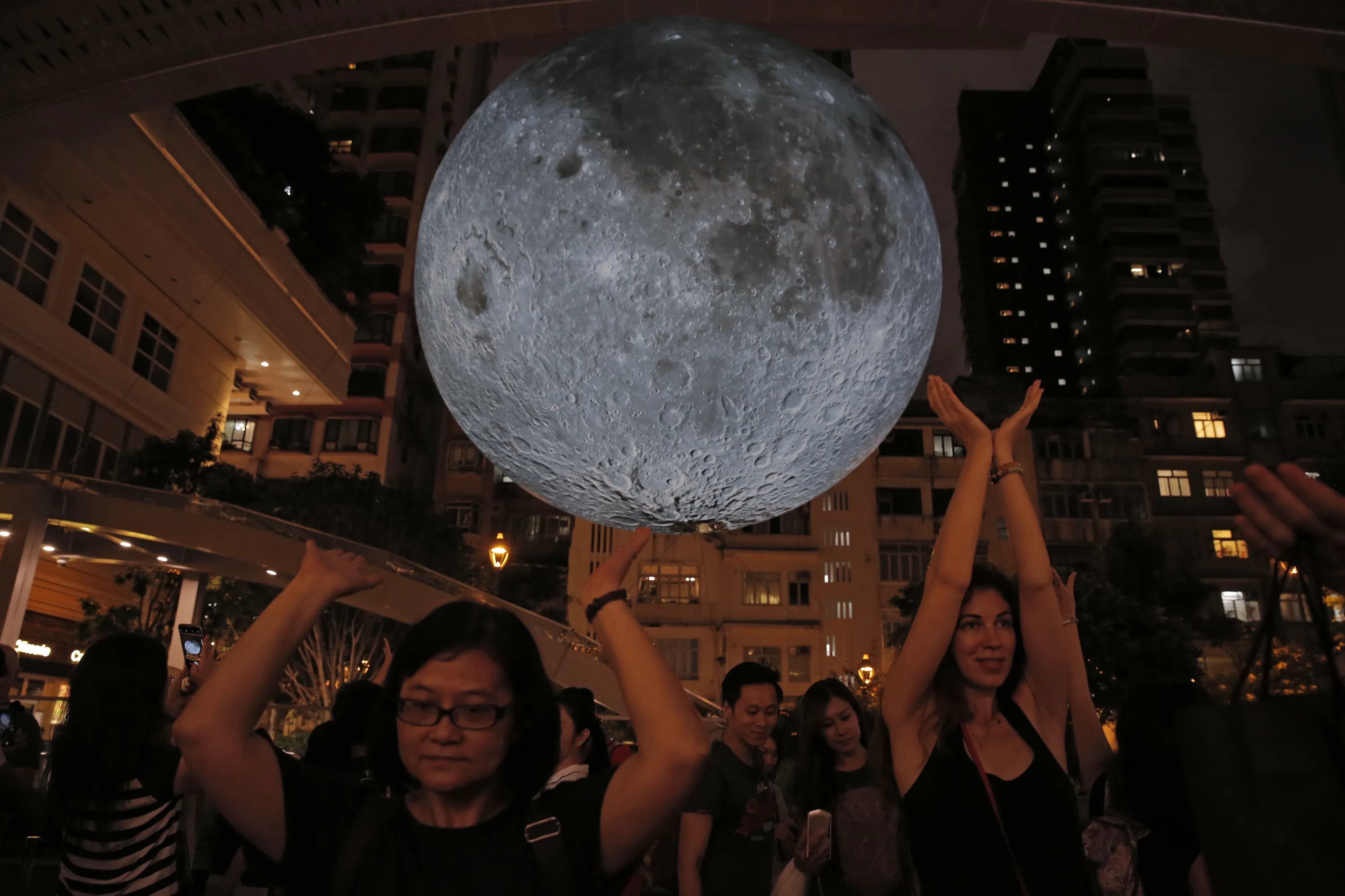 Visitors pose for photographs in front of an installation “Museum of the Moon”, a giant seven-meter-wide glowing sculpture of the moon, created by British artist Luke Jerram in Hong Kong to celebrate the Mid-Autumn Festival, Wednesday, October 4, 2017. (Photo by Kin Cheung/AP Photo)