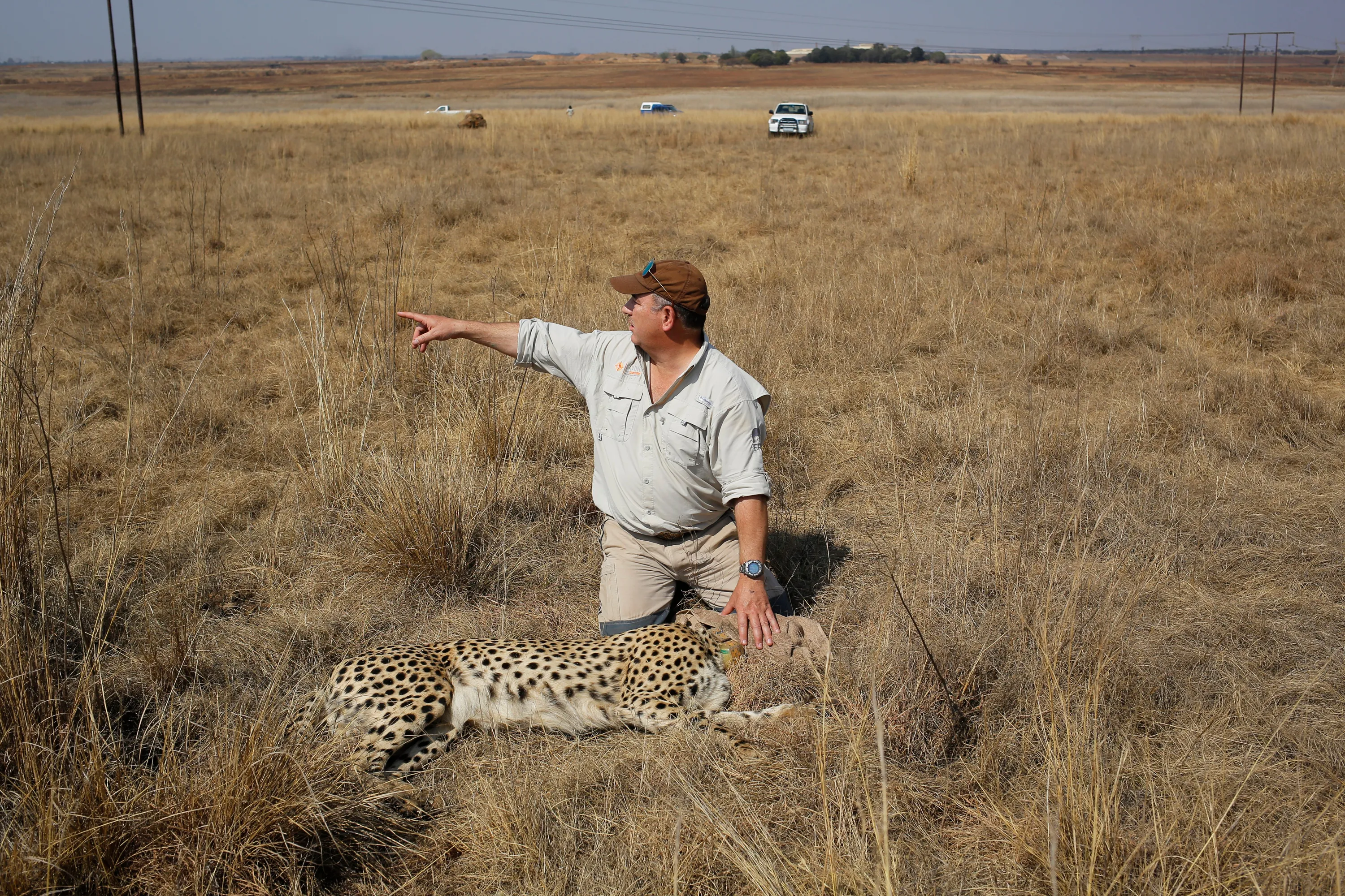 Dr Johan Marais sits with a cheetah they just darted to remove a malfunctioning collar at the Rietvlei Nature Reserve, Pretoria, South Africa, 07 September 2017. (Photo by Kim Ludbrook/EPA/EFE)