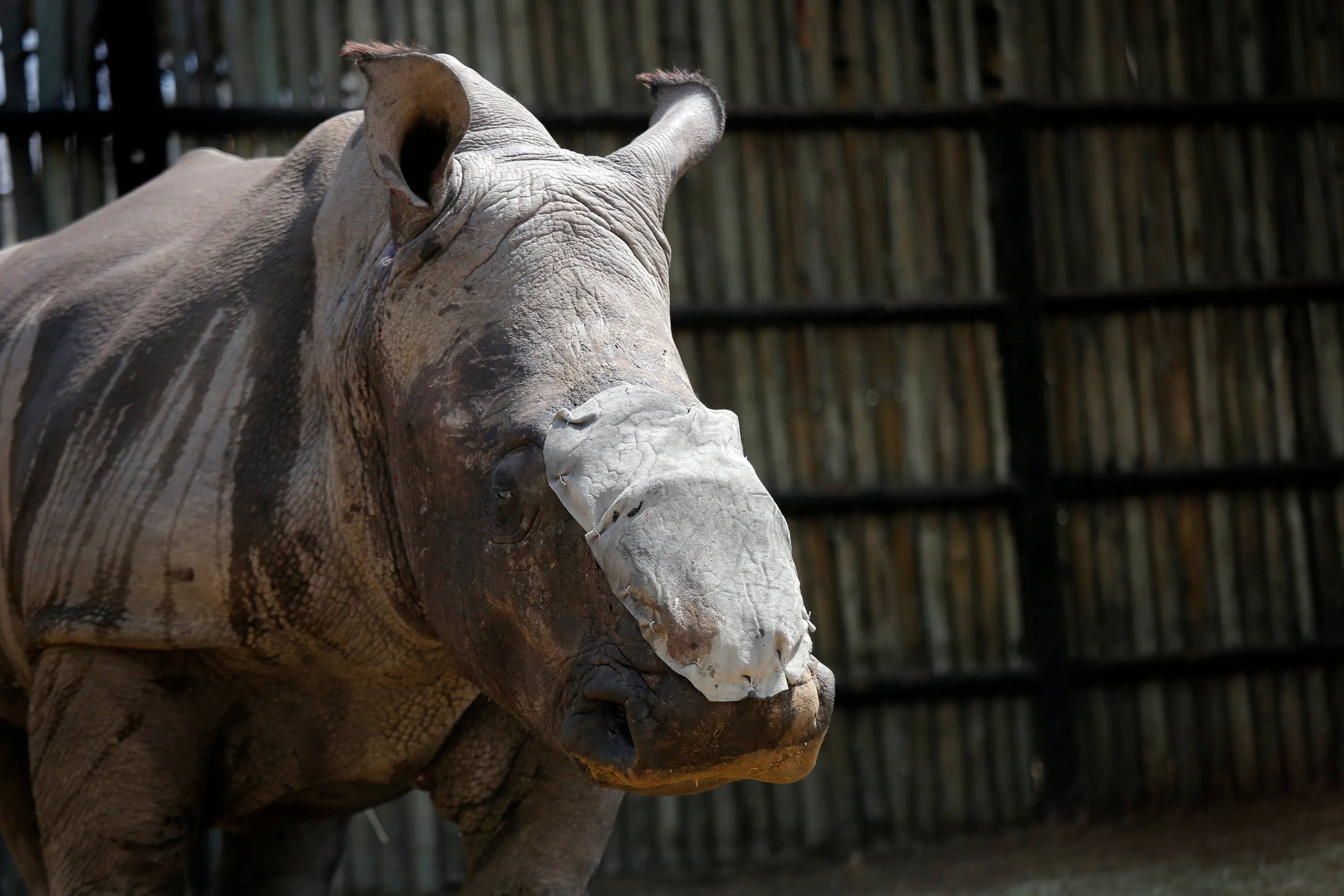A three-years-old White male Rhino Wasinda, recovers after his open wound was cleaned and a piece of elephant hide was attached to cover the wound at a private game farm in the Free State Province, Clocolan, South Africa, 19 September 2017. (Photo by Kim Ludbrook/EPA/EFE)