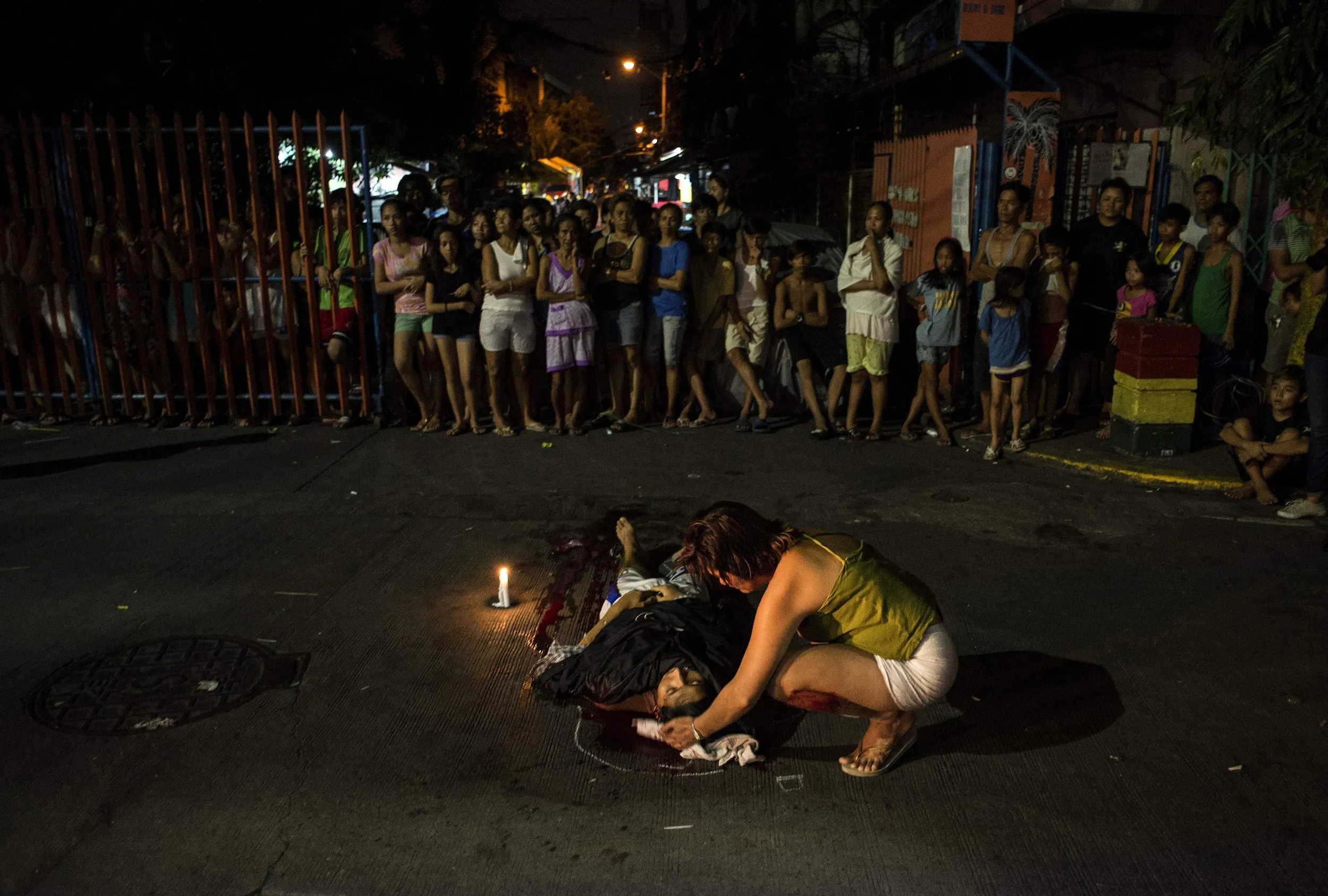 Nanette Castillo looks at the dead body of her son Aldrin, an alleged drug user killed by unidentified assailants, in Manila on October 3, 2017. Philippines police officers who want to speak out about “extrajudicial killings and summary executions” in President Rodrigo Duterte's drug war have been offered sanctuary and legal help by the Catholic Church. The Catholic Church, which counts 80 percent of Filipinos as followers, has been one of the leading critics of the drug war and its offer to police on Monday was another step in its efforts to stop the killings. (Photo by Noel Celis/AFP Photo)