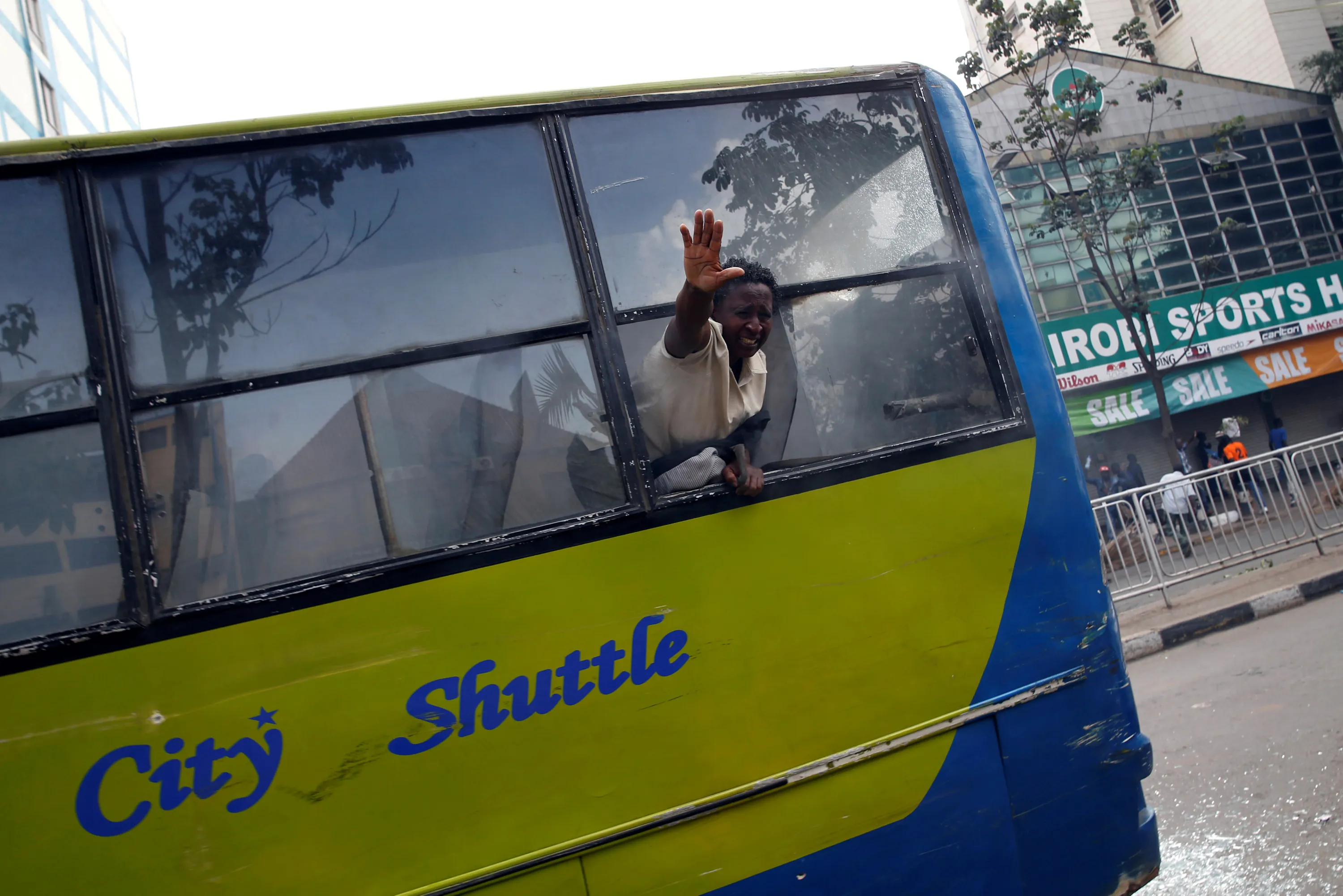 A woman tries to escape from a bus after riot policemen fired a tear gas canister at the public vehicle during clashes between supporters of Kenya's President Uhuru Kenyatta and supporters of Kenyan opposition National Super Alliance (NASA) coalition, during a protest in Nairobi, Kenya on October 11, 2017. (Photo by Baz Ratner/Reuters)