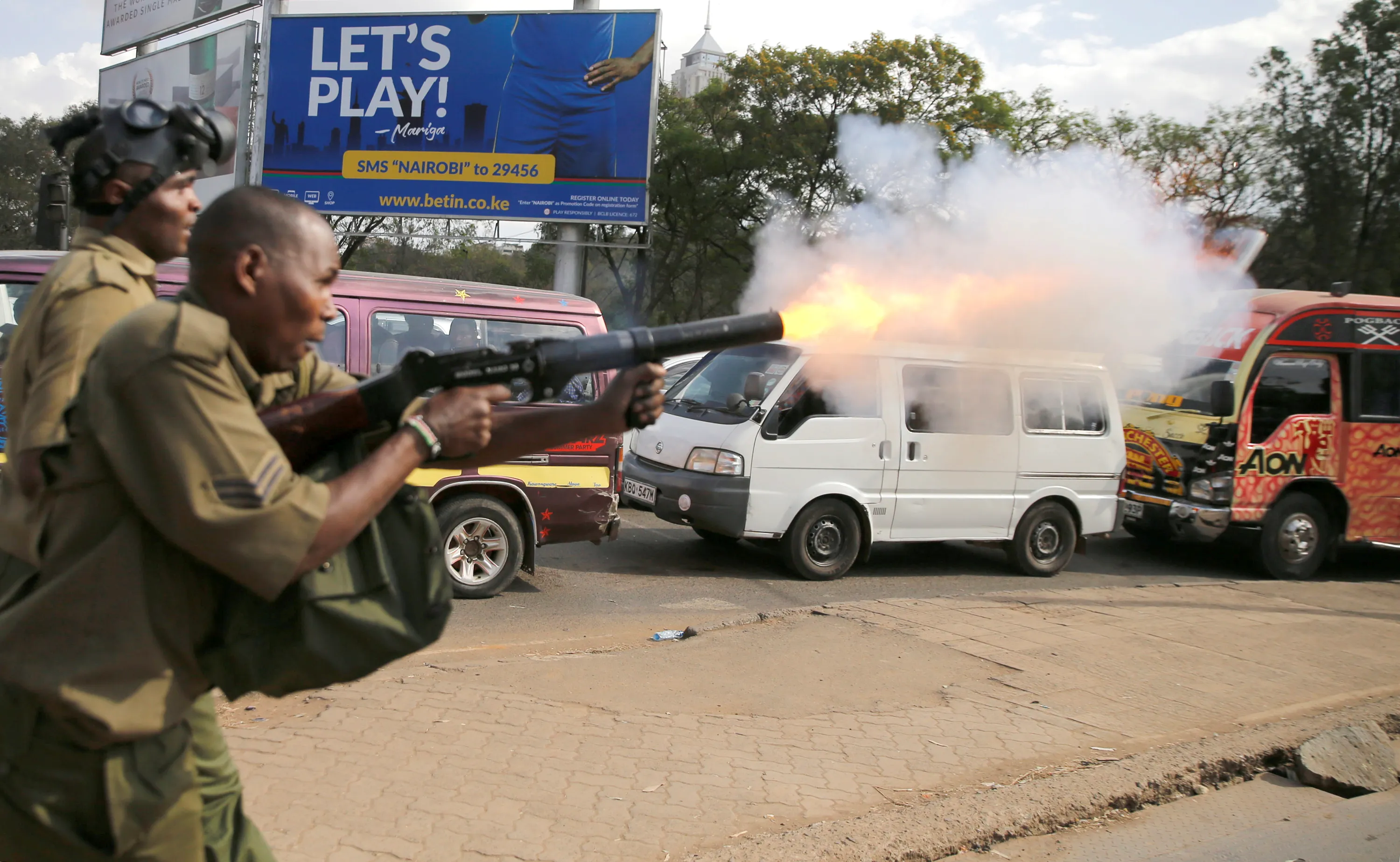 A riot policeman fires a tear gas canister to disperse opposition National Super Alliance (NASA) coalition during a protest calling for the sacking of election board officials involved in August's cancelled presidential vote, in Nairobi, Kenya on October 6, 2017. (Photo by Thomas Mukoya/Reuters)