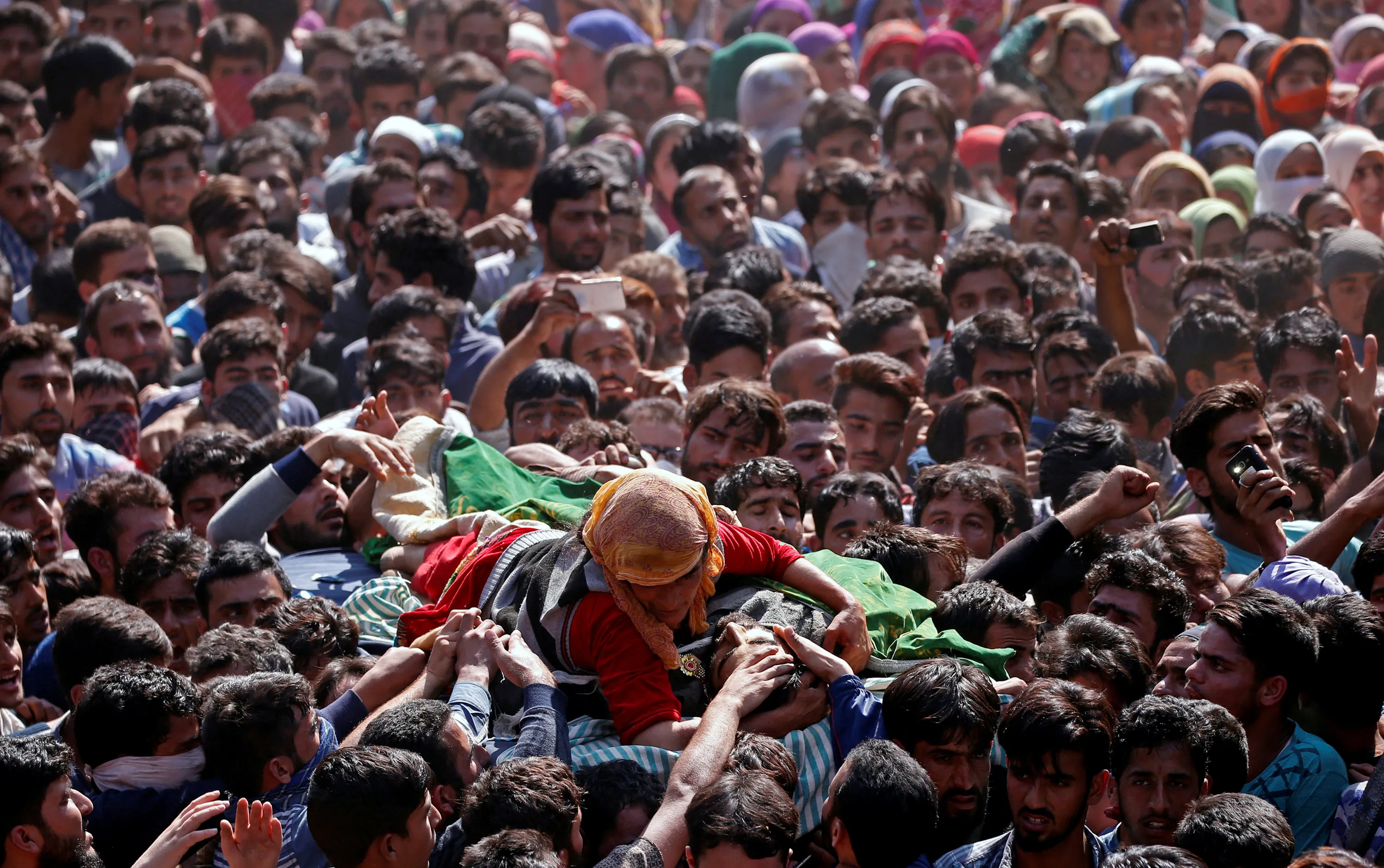 A woman clings to the body of Nasrullah Mir, a suspected militant, who according to the local media was killed during a gun battle with Indian security forces in the Hajin area of Bandipora district, Kashmir, October 11, 2017. (Photo by Danish Ismail/Reuters)