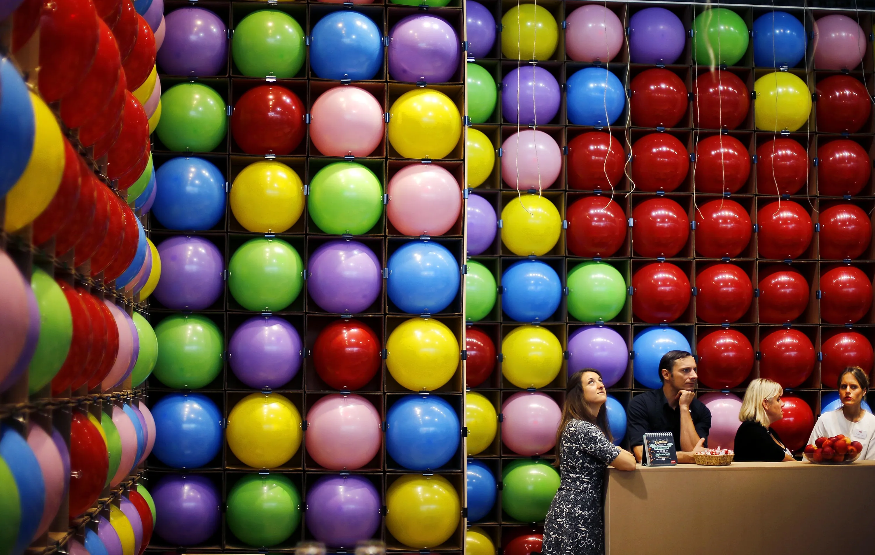 Employees of a publisher are surrounded by balloons as they wait for customers at the Book Fair in Frankfurt, Germany, Wednesday, October 11, 2017. (Photo by Michael Probst/AP Photo)