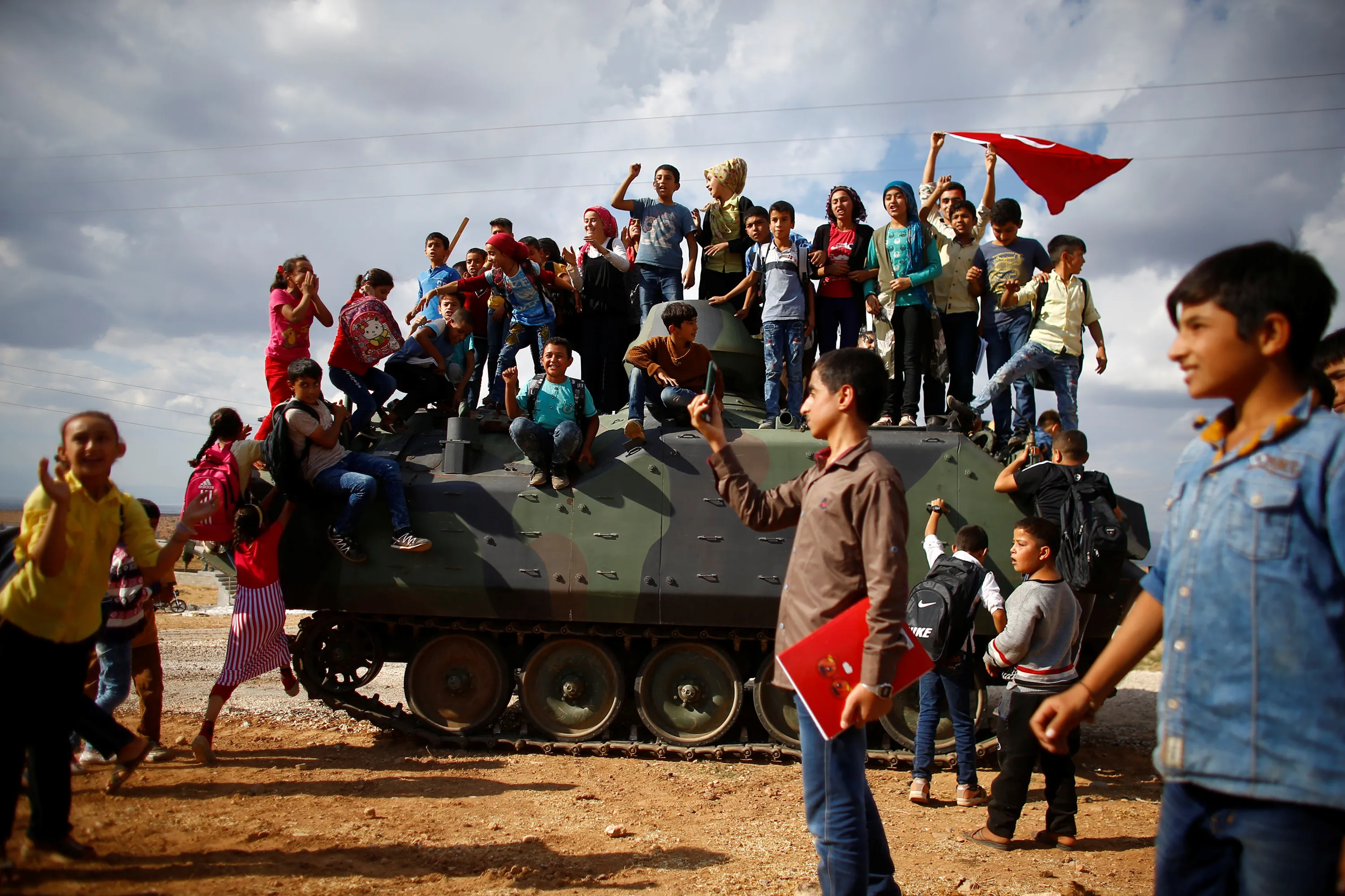 Children stand on top of a Turkish Armed Forces vehicle, as a military convoy pass by their village on the Turkish-Syrian border line in Reyhanli, Hatay province, Turkey on October 12, 2017. (Photo by Osman Orsal/Reuters)
