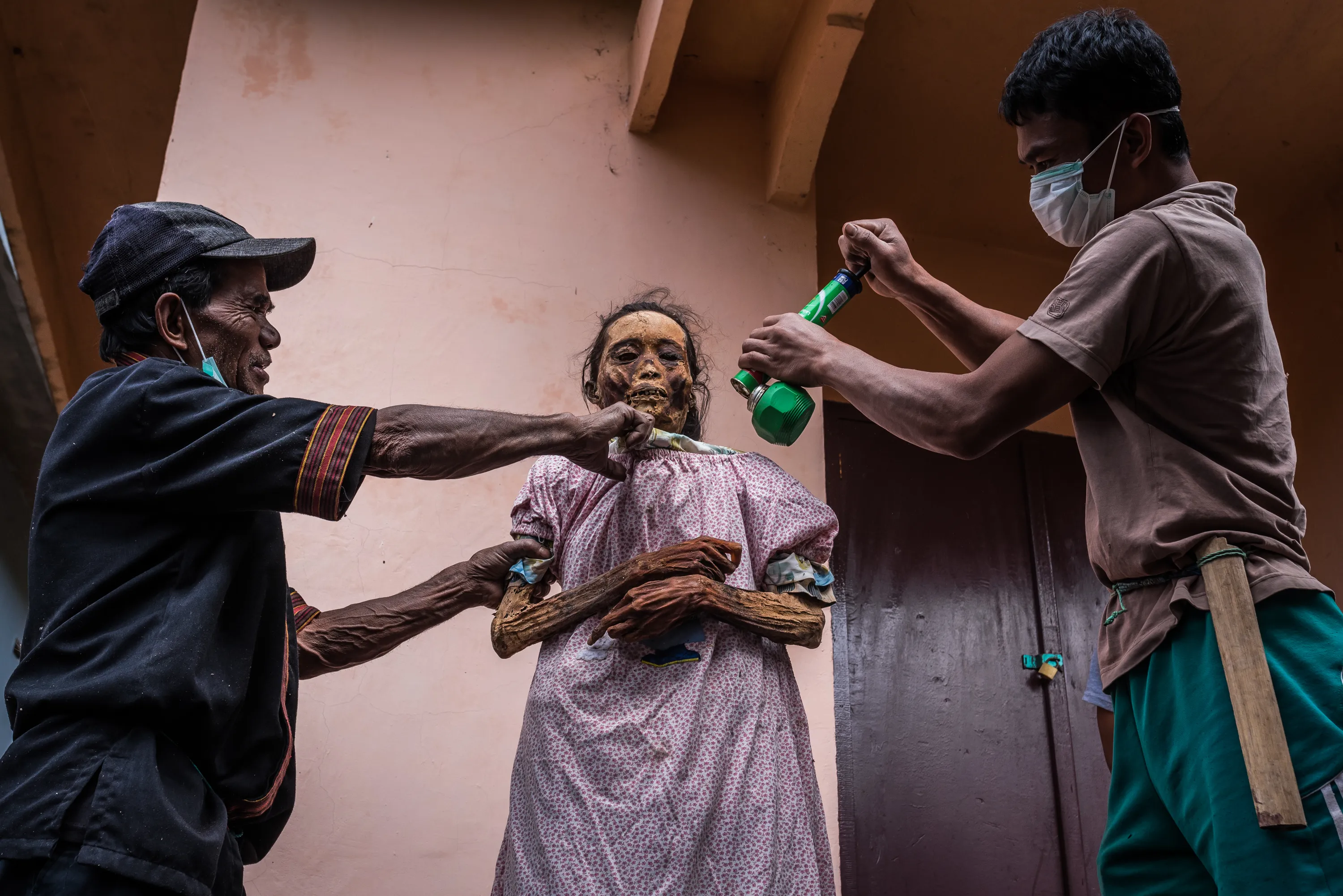 After the funeral rites of “Rambu Solo”, the deceased are finally buried in tombs. But still they are regularly visited, cleaned and given new clothes in a ritual known as Ma’nene (“Care of Ancestors”). Datu died 35 years ago. In this picture relatives are removing the insects that covered her. (Photo by Claudio Sieber Photography/The Guardian)