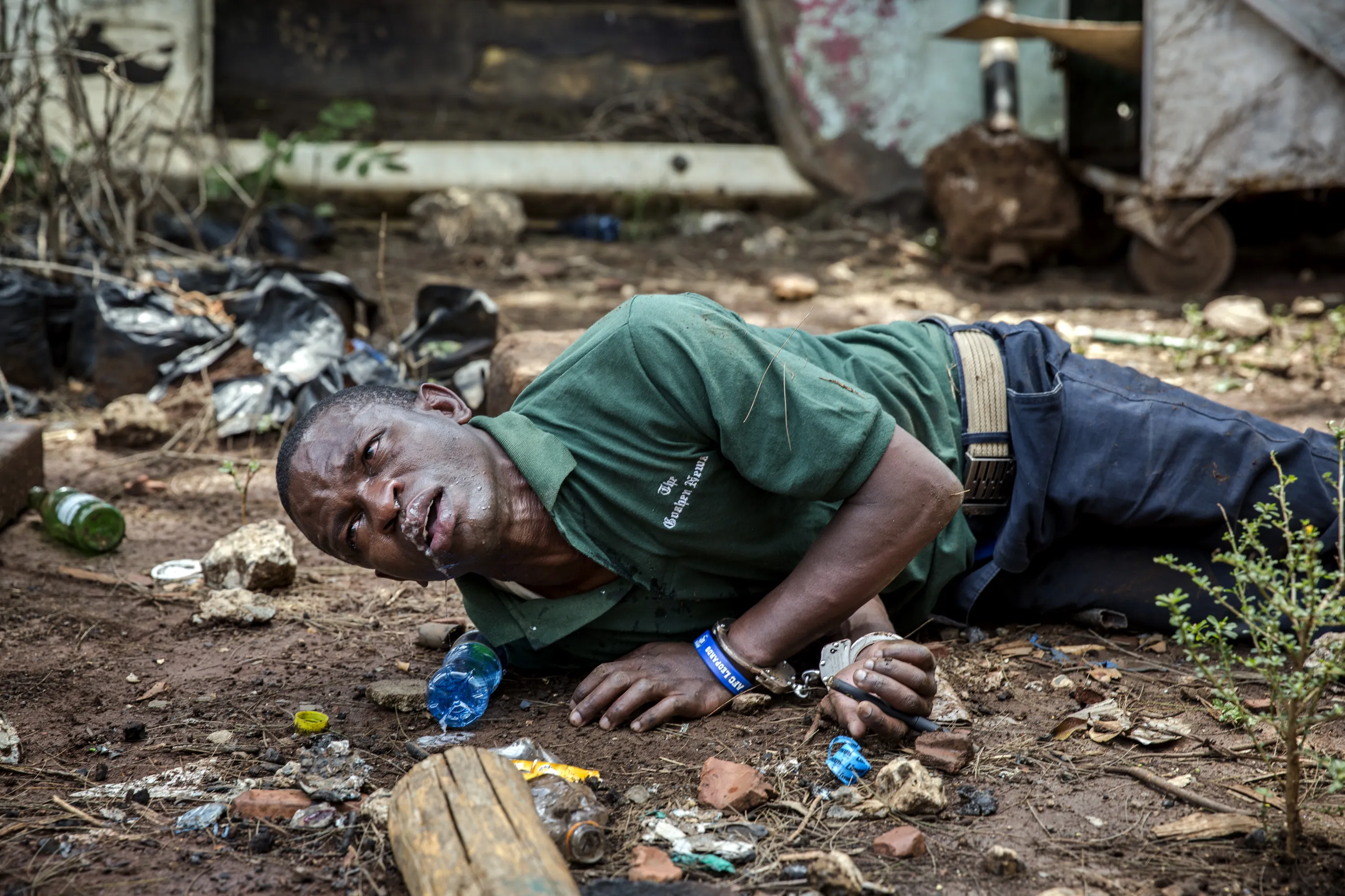 A protester seriously affected by tear gas and allegedly beaten up by police officers lays on the ground with handcuffs on after being arrested in Uhuru Park in Nairobi, on October 13, 2017. Hundreds of opposition supporters took to the streets of Kenya's main cities on October 13 in defiance of a government ban on protests as the country is gripped by uncertainty over its presidential election. (Photo by Luis Tato/AFP Photo)