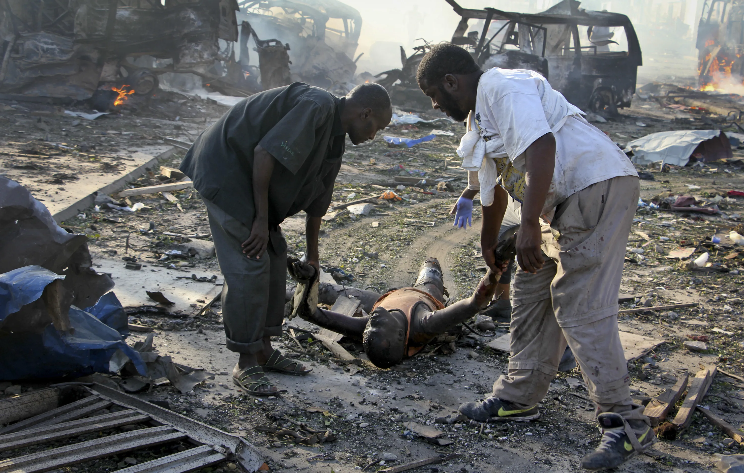 Somalis remove the body of a man killed in a blast in the capital Mogadishu, Somalia Saturday, October 14, 2017. (Photo by Farah Abdi Warsameh/AP Photo)