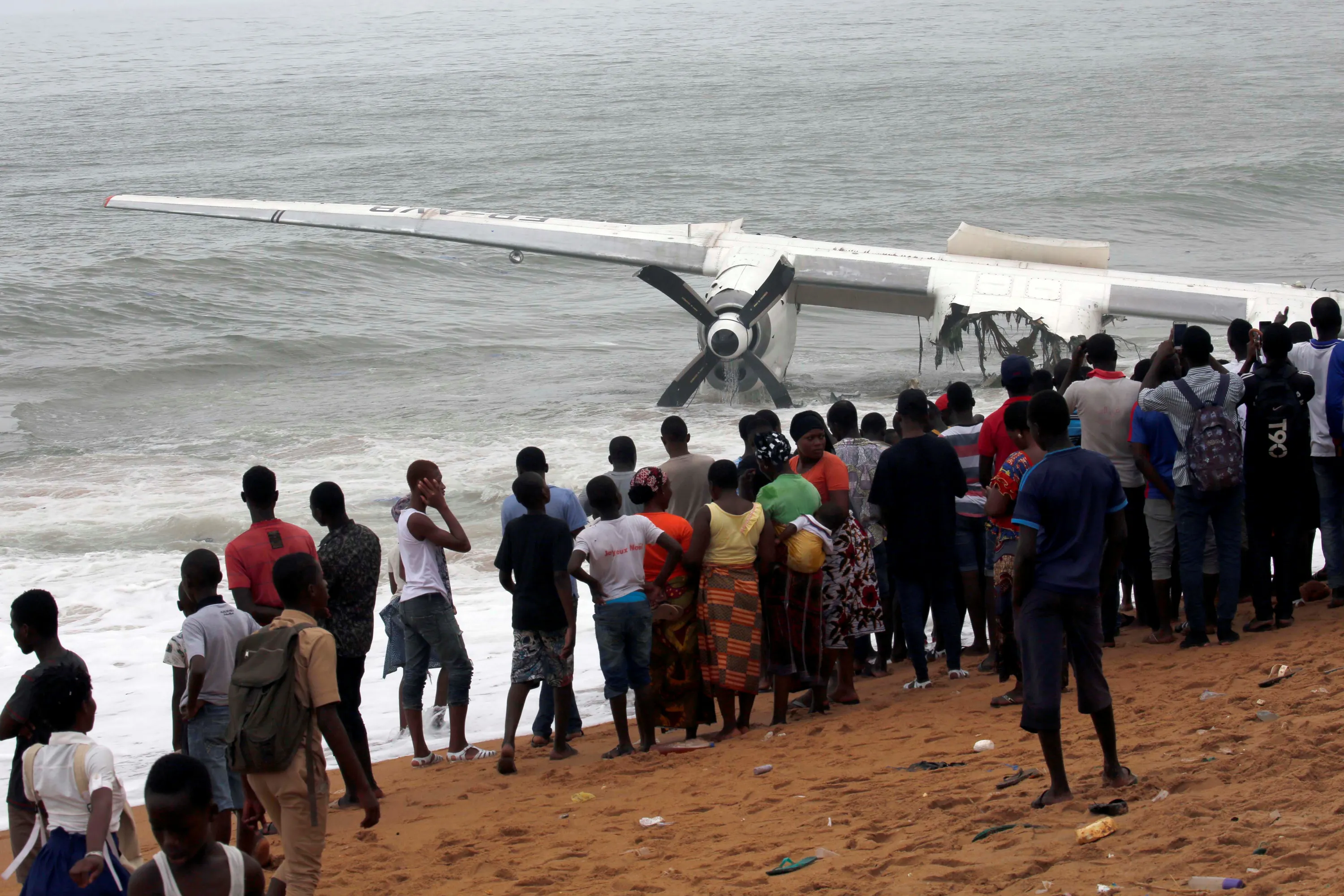 People gather to look at the remains of a cargo plane that crashed in the sea near the international airport in Ivory Coast's main city, Abidjan on October 14, 2017. (Photo by Luc Gnago/Reuters)