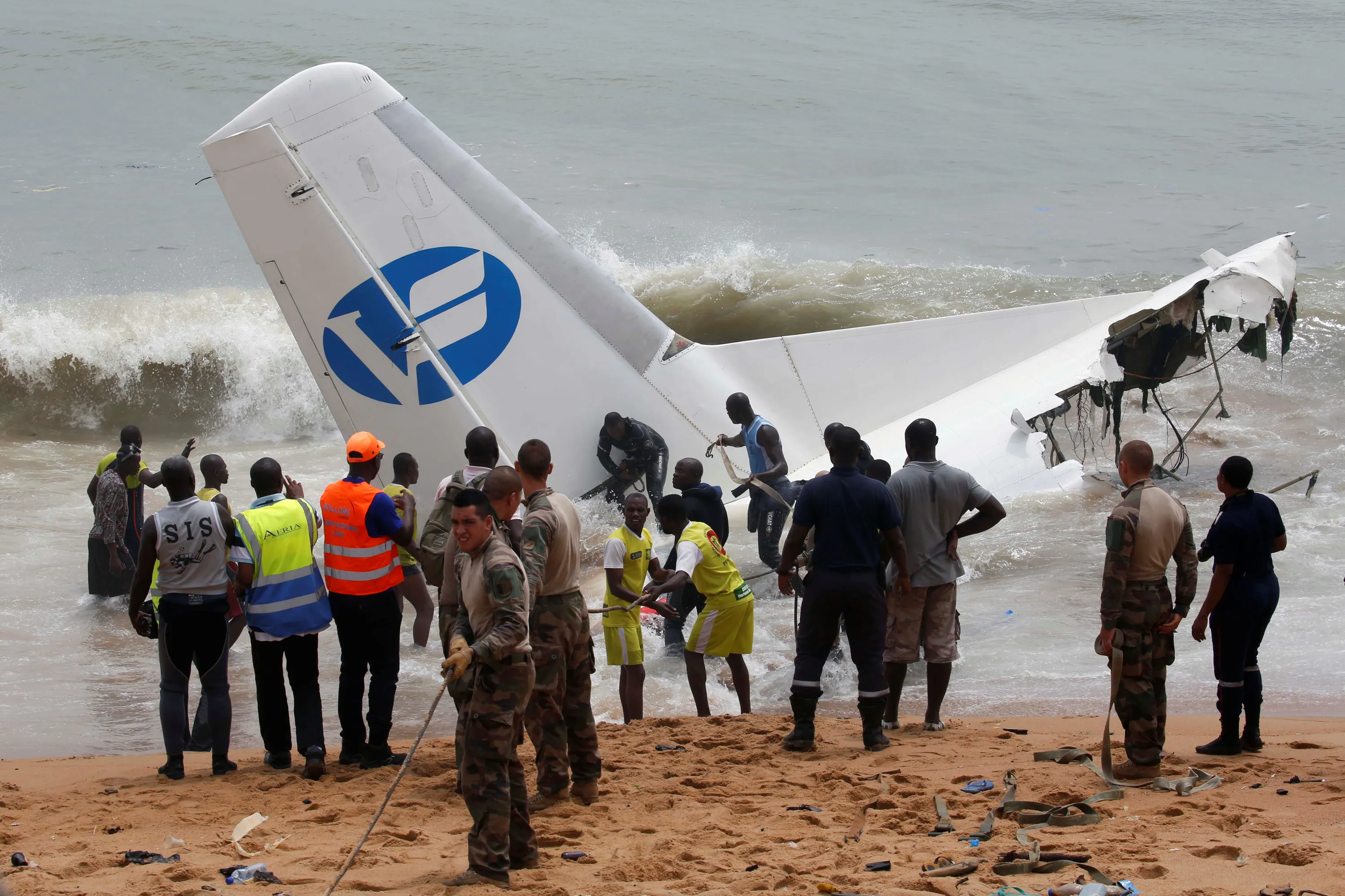 French soldiers and rescuers prepare to pull the remains of a cargo plane that crashed in the sea near the international airport in Ivory Coast's main city, Abidjan on October 14, 2017. (Photo by Luc Gnago/Reuters)