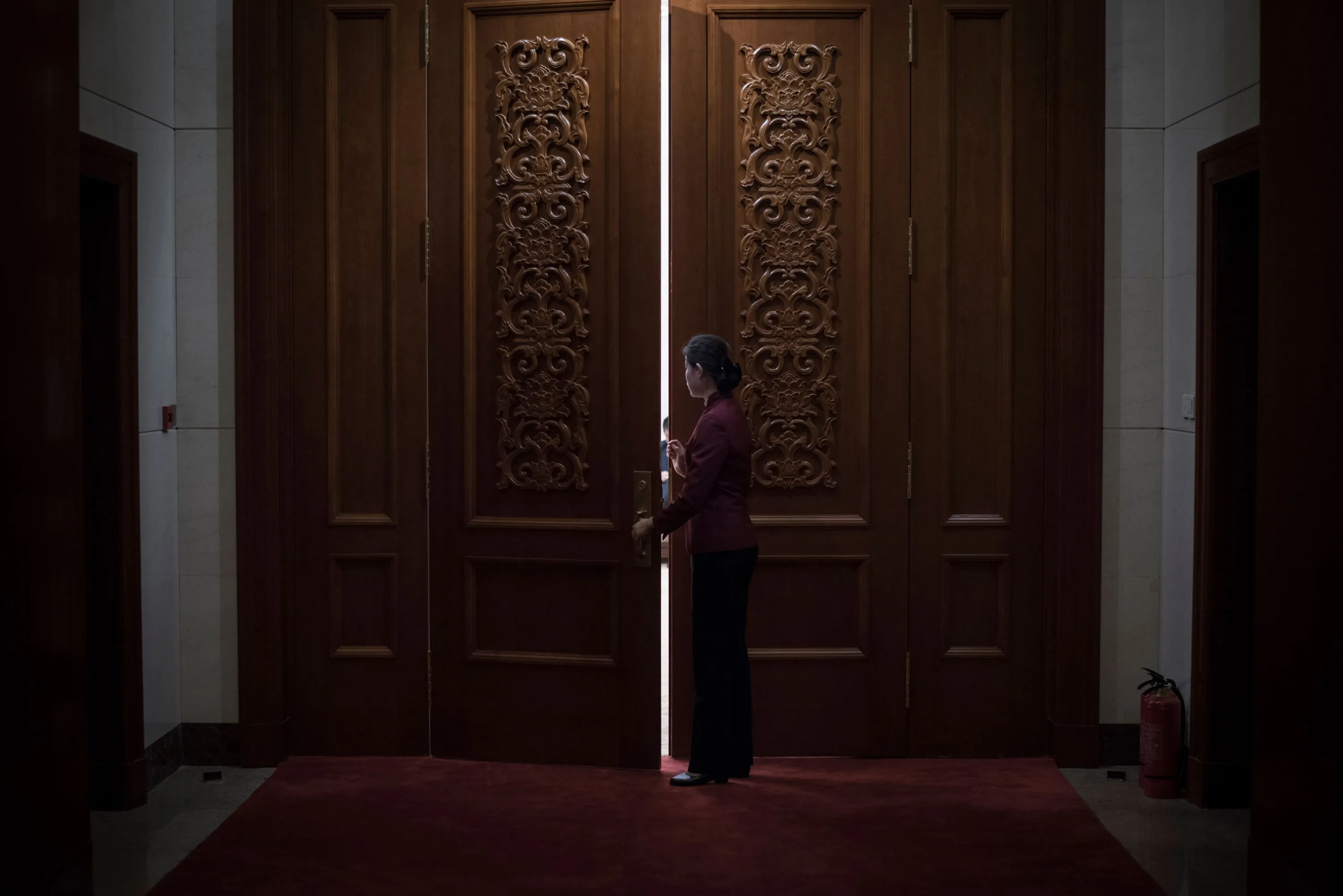 A hostess closes the door of a meeting room at the Great Hall of the People during the Communist Party's 19th Congress in Beijing on October 19, 2017. The Chinese Communist Party opens its week-long, twice-a-decade congress on October 18 at the Great Hall of the People. (Photo by Fred Dufour/AFP Photo)