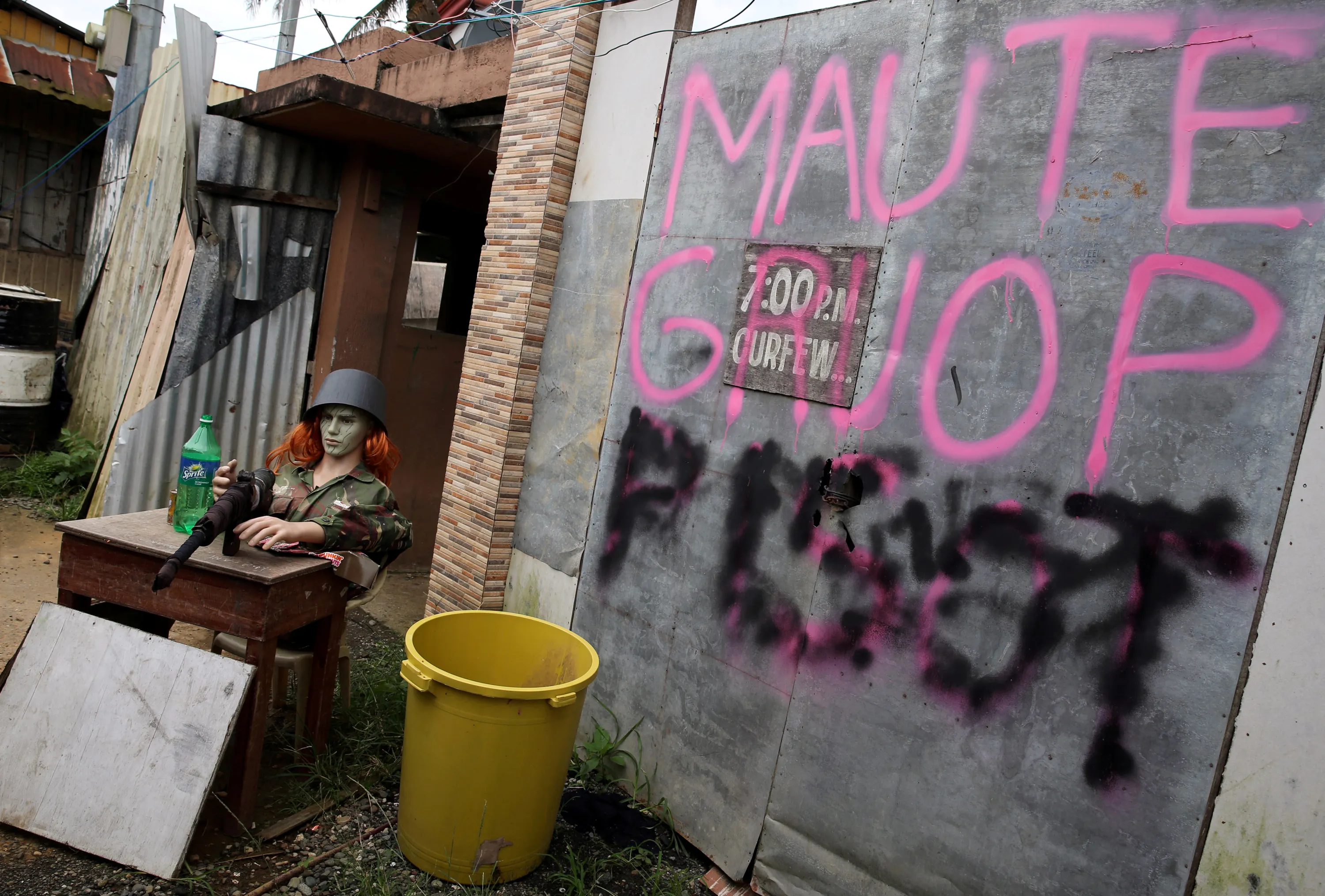 A mannequin dressed in a military uniform with a dummy sniper rifle is displayed in front of a military post at Mapandi town in Marawi city, southern Philippines on October 19, 2017. (Photo by Romeo Ranoco/Reuters)