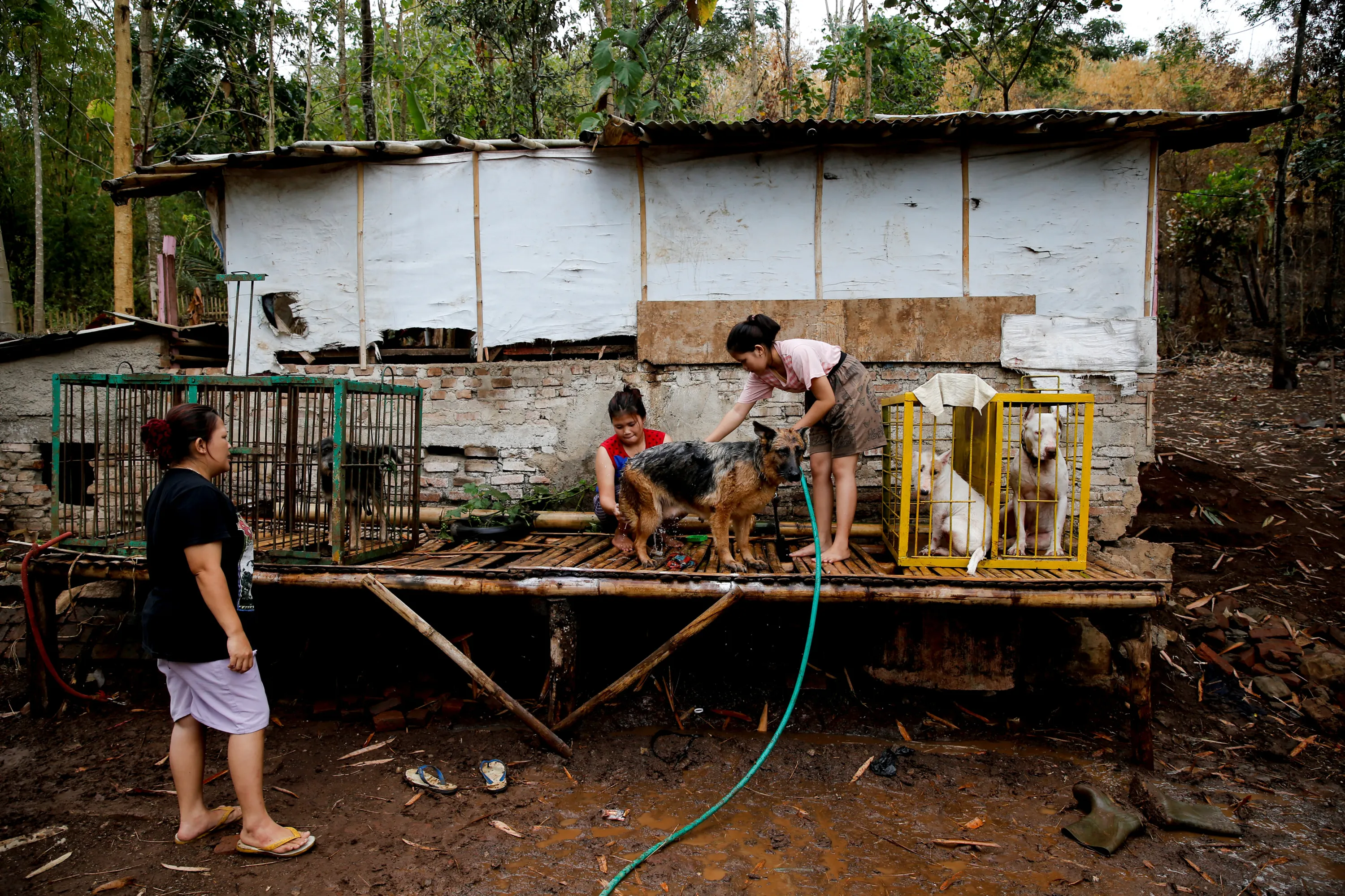 Dog breeder Agus Badud's wife and daughter wash dogs at their house at Cibiuk village of Majalaya, West Java province, Indonesia, September 27, 2017. (Photo by Reuters/Beawiharta)