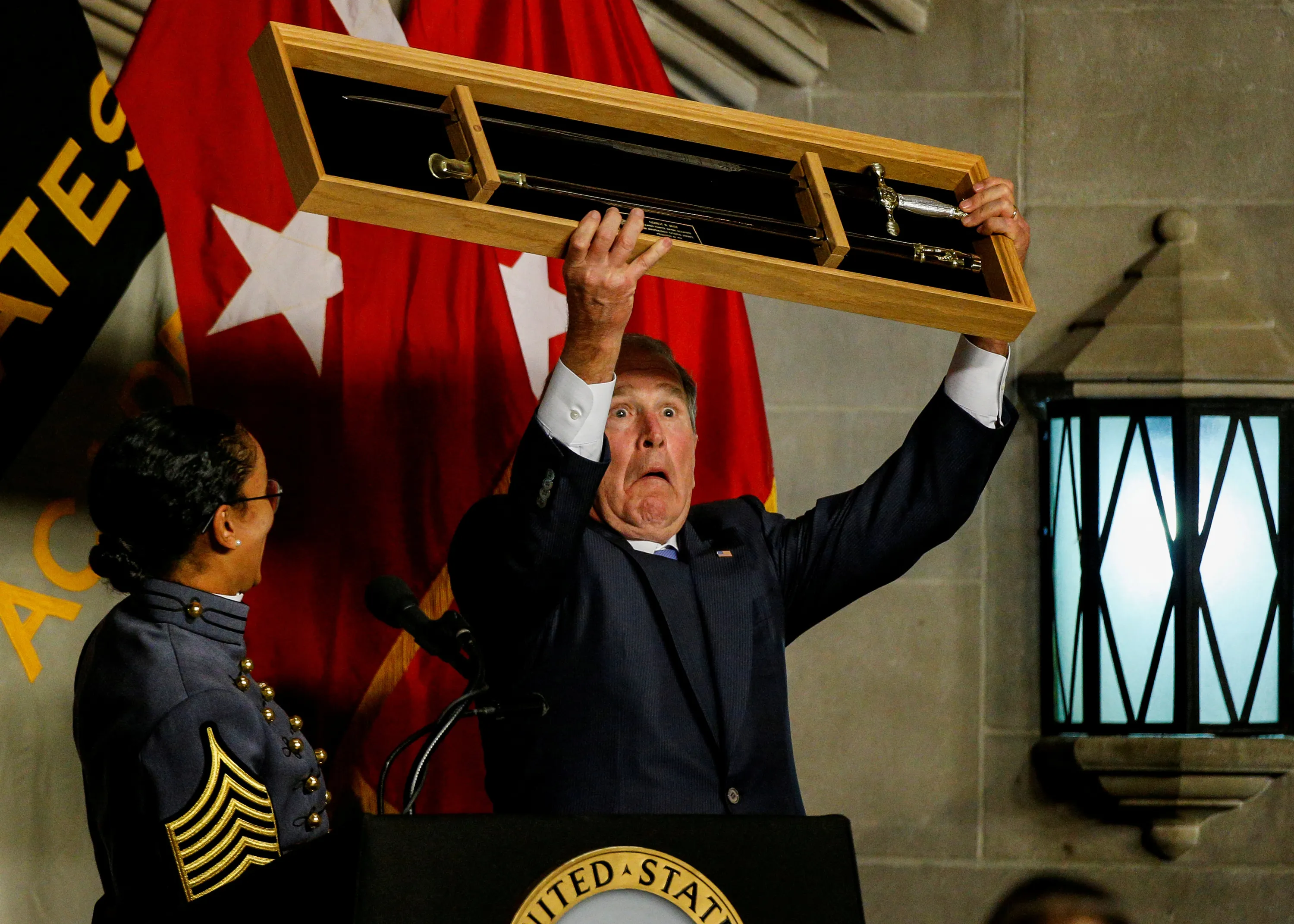 First Captain of West Point's Corps of Cadets presents Former U.S. President George W. Bush with a Cadets' Sword as he is honored with the Sylvanus Thayer Award at the United States Military Academy in West Point, New York, U.S., October 19, 2017. (Photo by Brendan McDermid/Reuters)