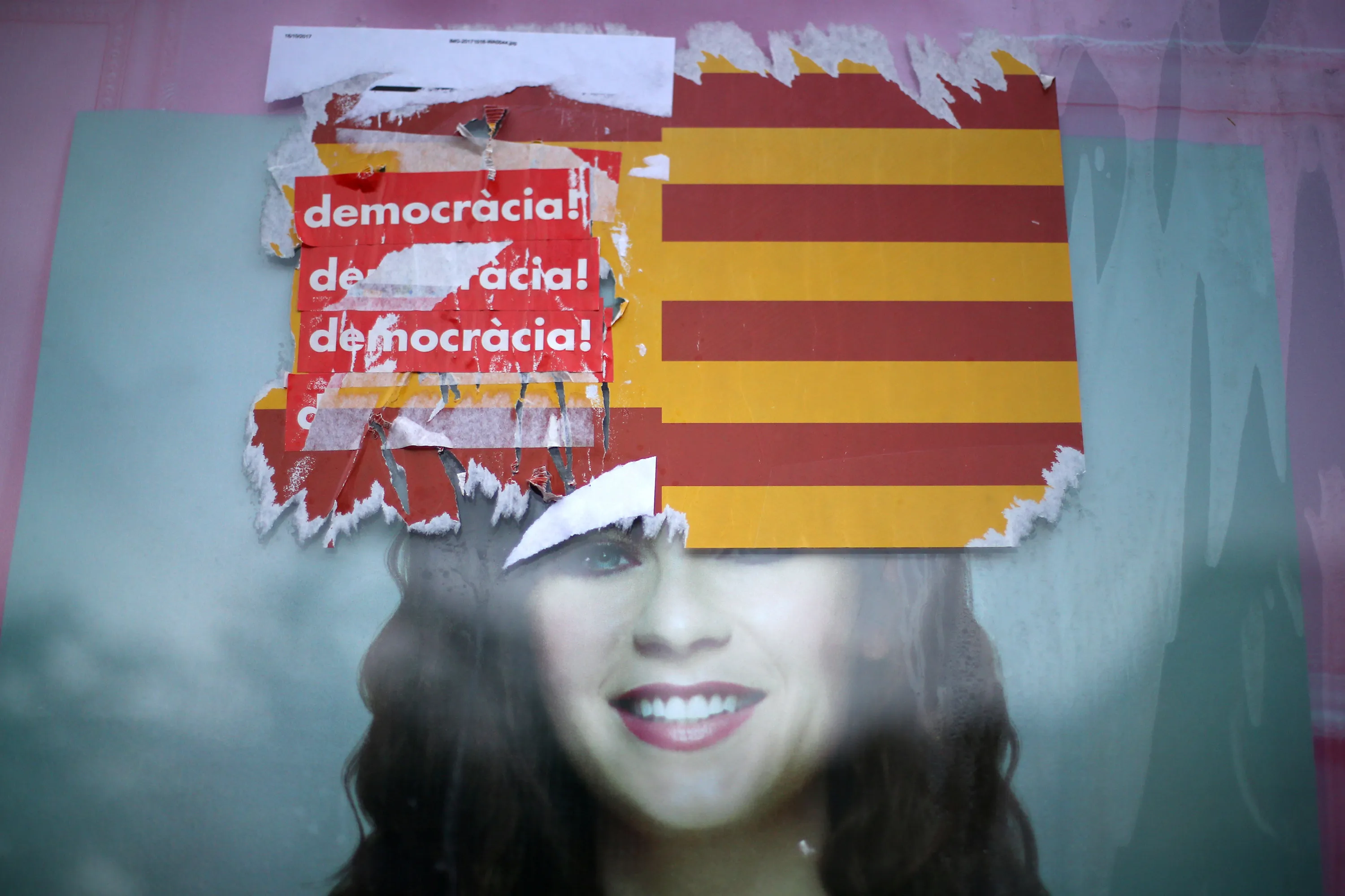 Stickers reading “Democracy!” are seen on Spanish and Catalan flags during the day of a protest against the transfer of the Sabadell and Caixa banks' headquarters out of Barcelona, Spain, October 20, 2017. (Photo by Ivan Alvarado/Reuters)