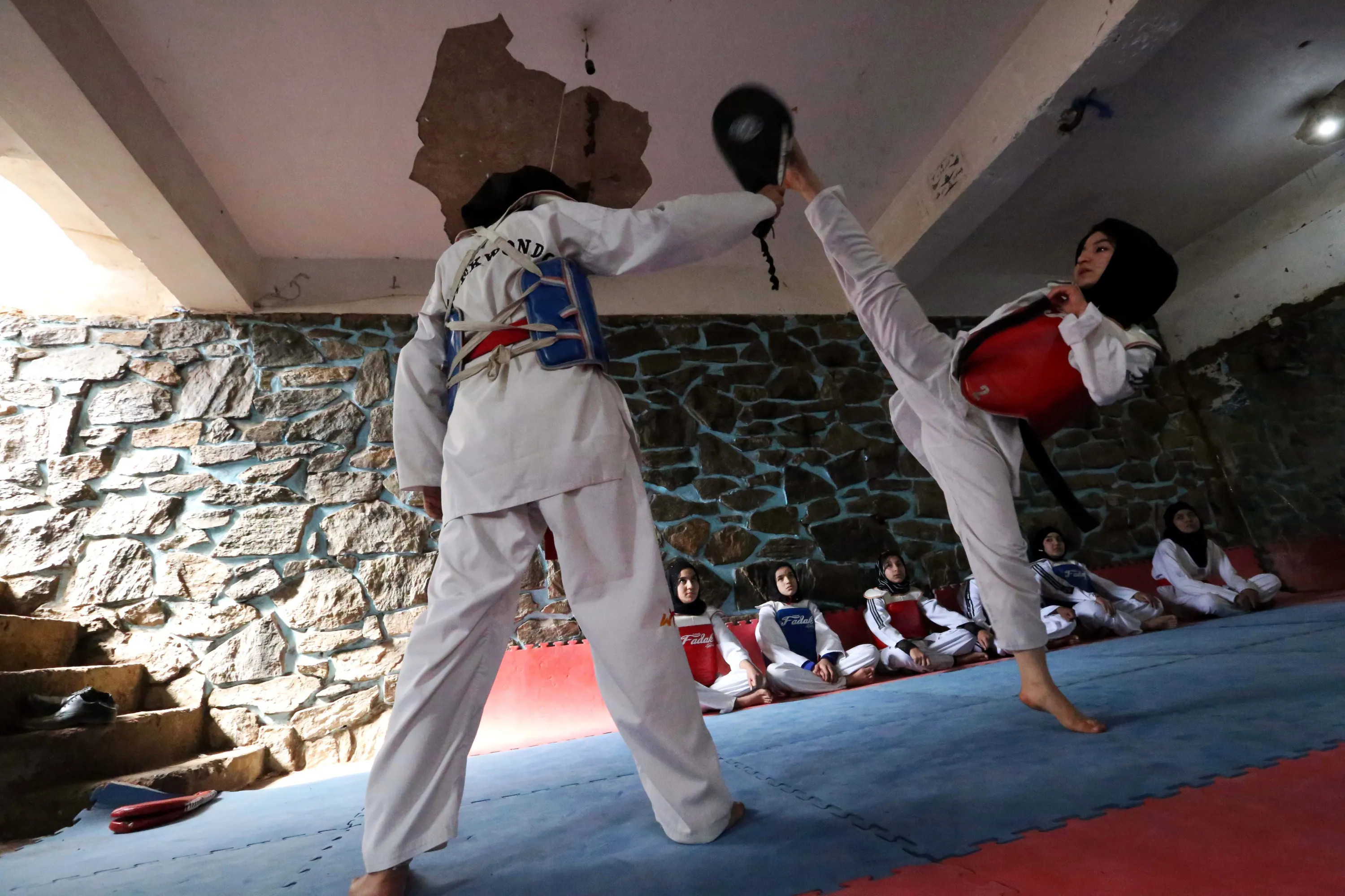 Afghan girls practice Taekwondo during a martial arts class in Herat, Afghanistan 02 March 2015. Sport was originally banned by the Taliban regime but after their ouster in 2001 by a US-led military operation, the country is slowly returning towards normalcy. (Photo by Jalil Rezayee/EPA)
